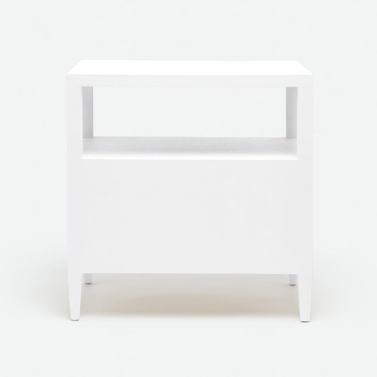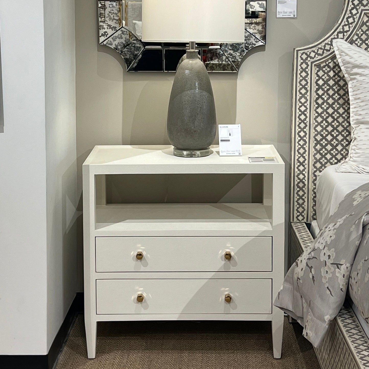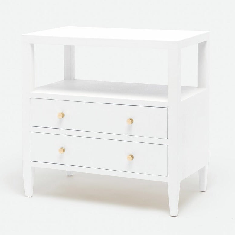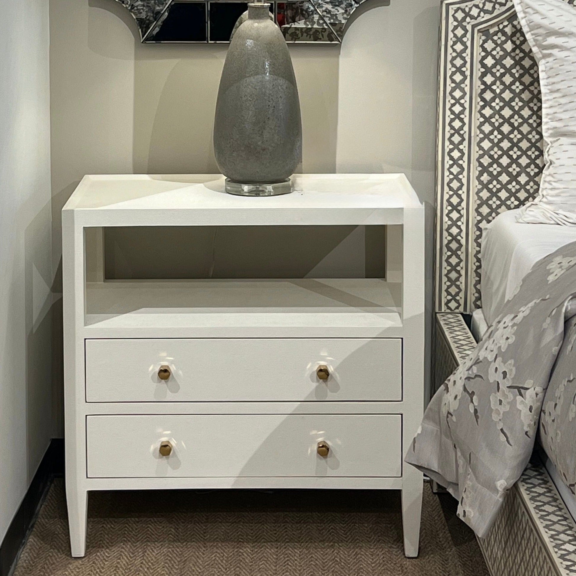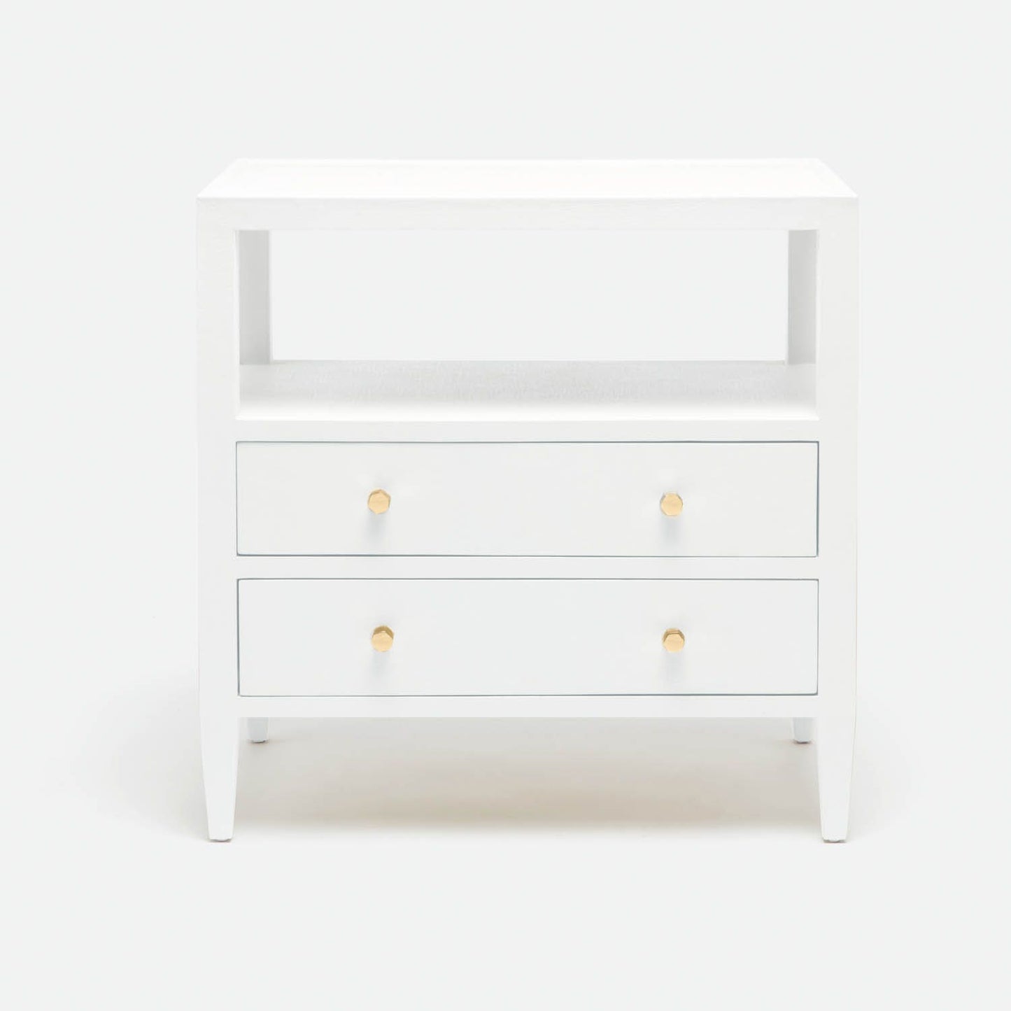 The Jarin Double Nightstand in Designer White Faux Belgian Linen from Made Goods comes in a designer white faux Belgian linen with gold finish hardware. This soft-close drawer nightstand offers the perfect amount of storage for your bed side.