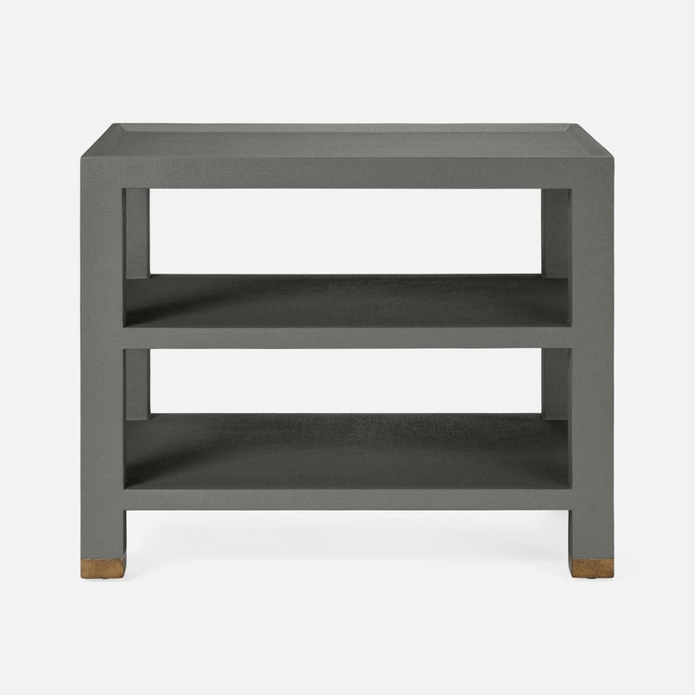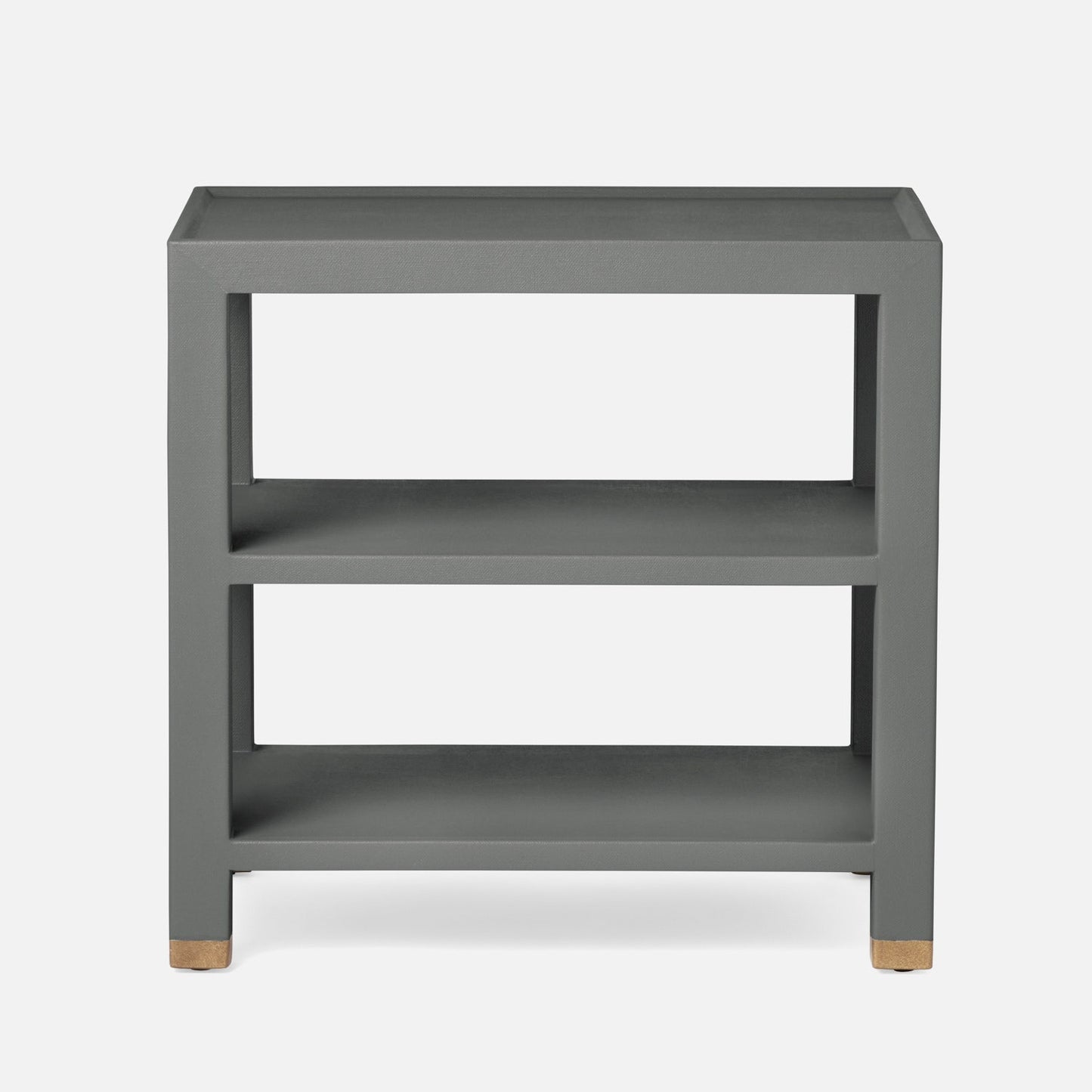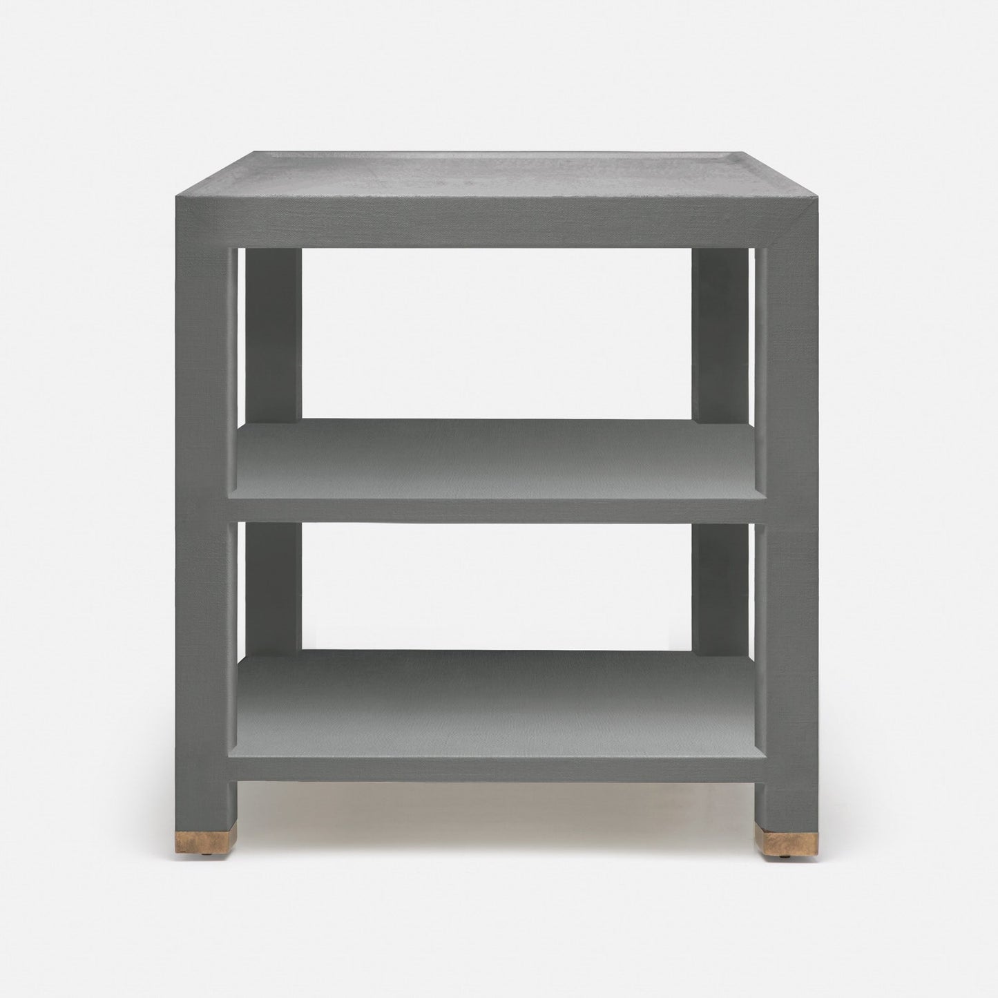 Elevate any space with the Jarin Side Table in Graphite Faux Belgian Linen from Made Goods. The brass detailing plays off of the graphite faux Belgian linen material adding a surprise element to this design.