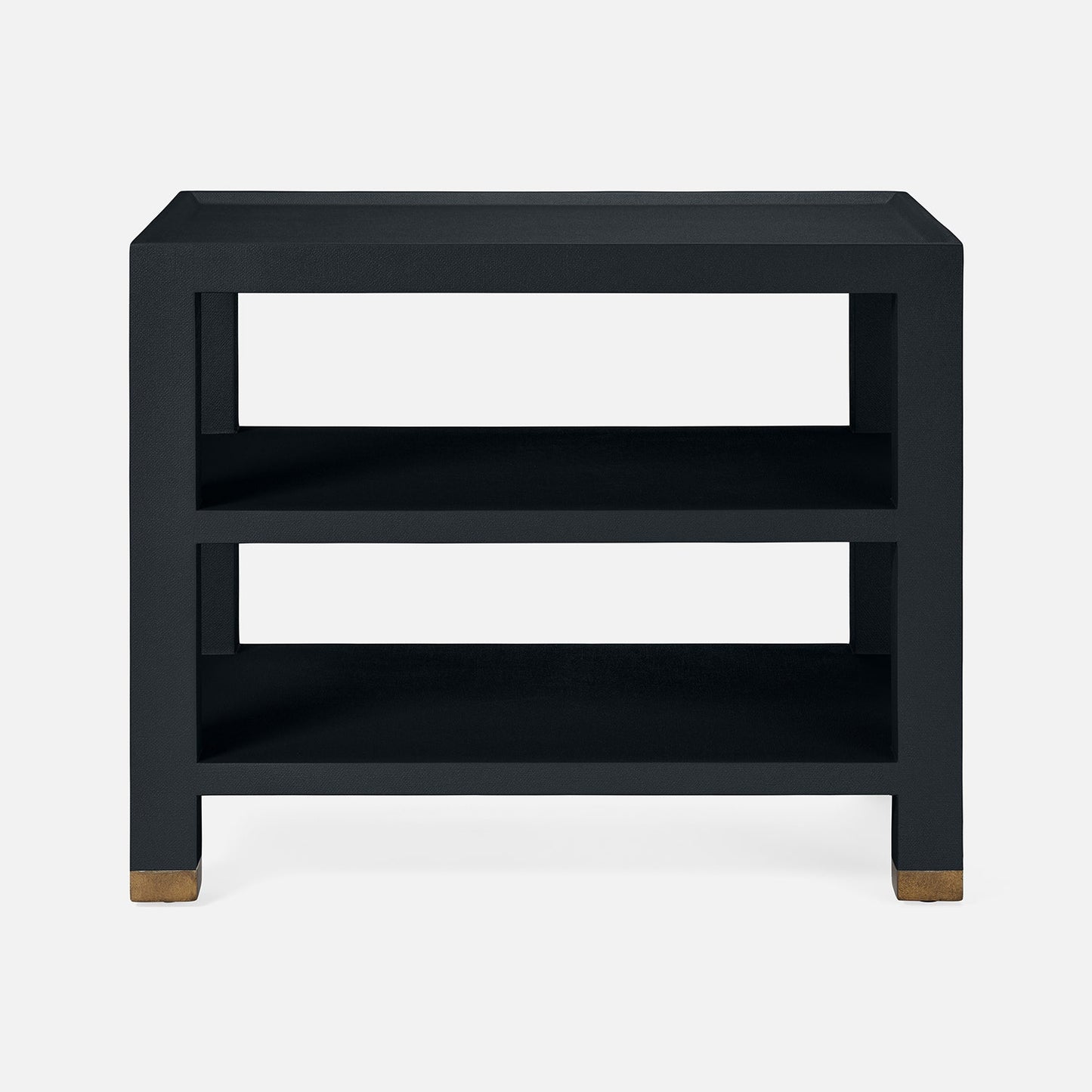 Elevate any space with the Jarin Side Table in Dark Navy Faux Belgian Linen from Made Goods. The brass detailing plays off of the dark navy faux Belgian linen material adding a surprise element to this design.