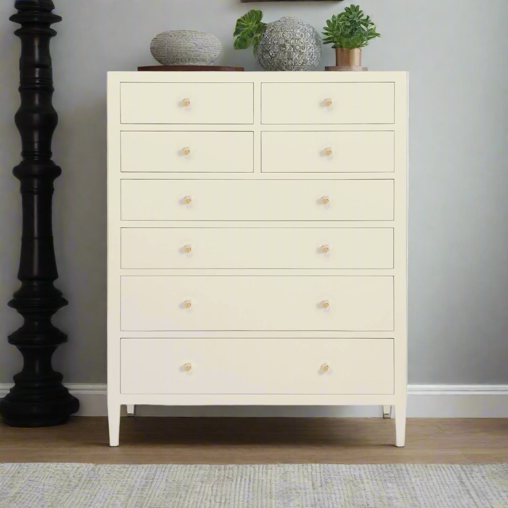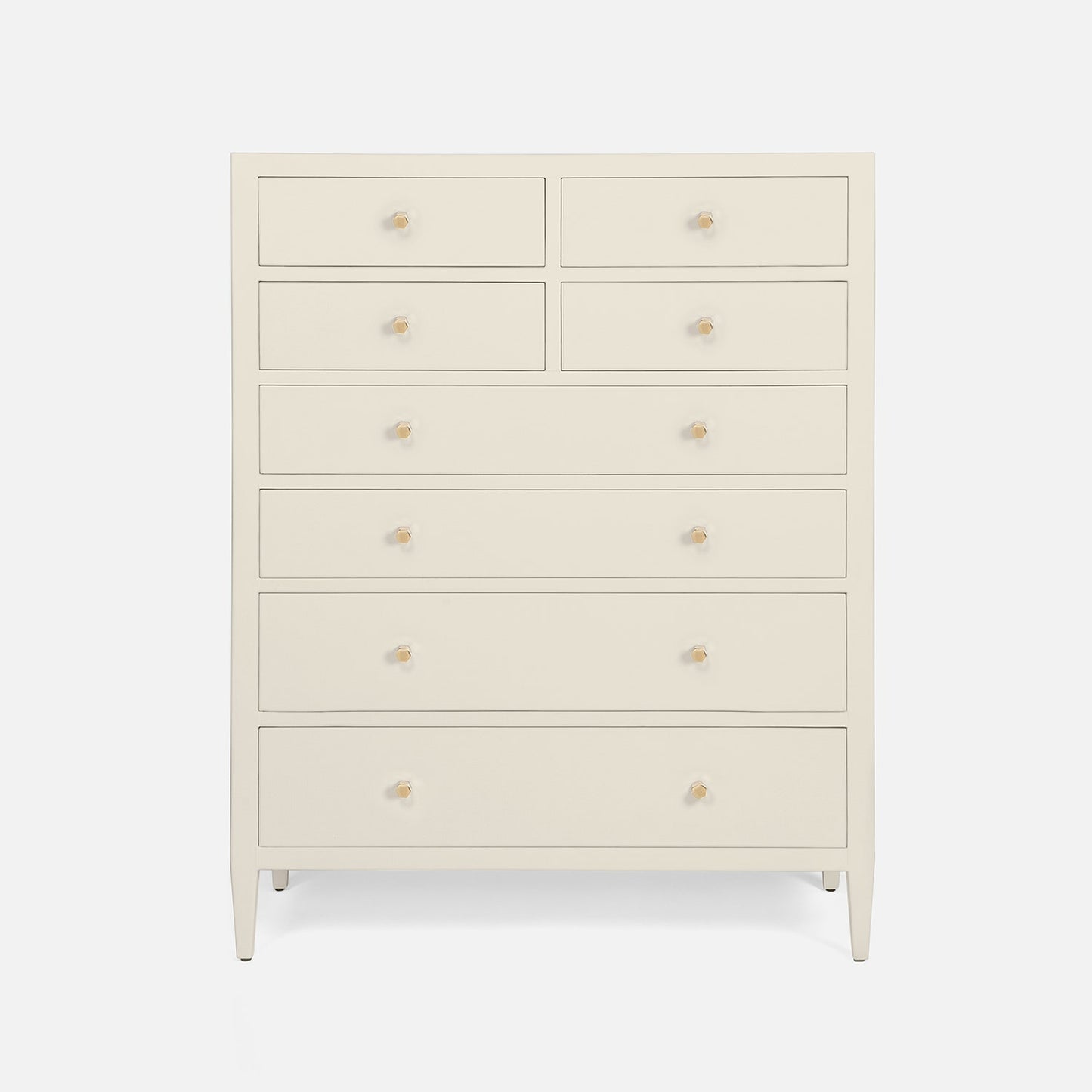 White Faux Belgian Linen; 8 Drawers; Brass Hardware