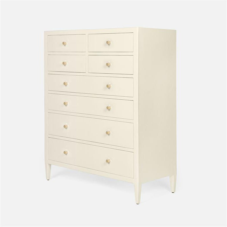 The Jarin Tallboy in White Faux Belgian Linen from Made Goods combines design with functionality. The tallboy is covered in glamorous faux Belgian linen and has eight wood-linen drawers offering ample storage.