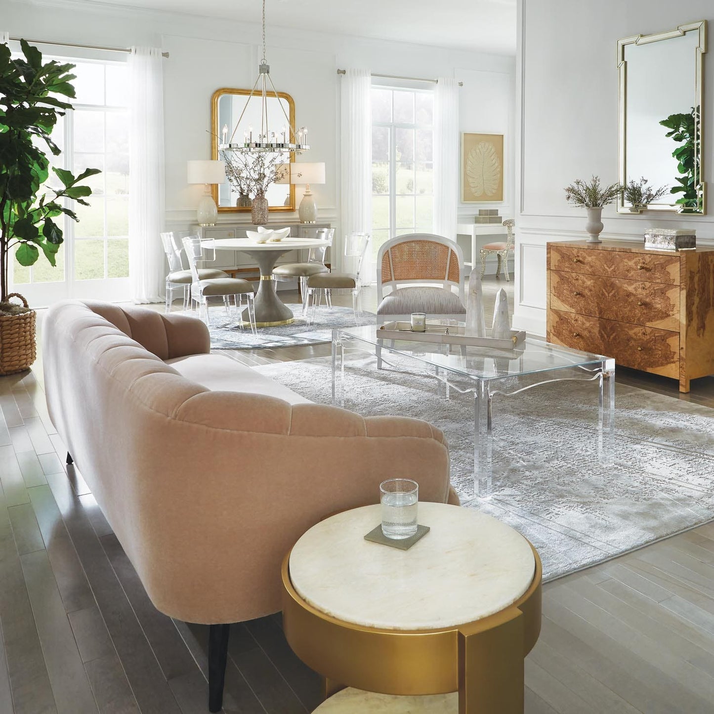 Crafted with White Crystal Stone and Warm Gold Metal by Made by Goods, the Kade Side Table boasts sparkling crystal stone accents and two tiers, featuring circular pieces at the top and bottom, both gently elevated. The natural material is given a contemporary touch with a simple yet open gold frame.