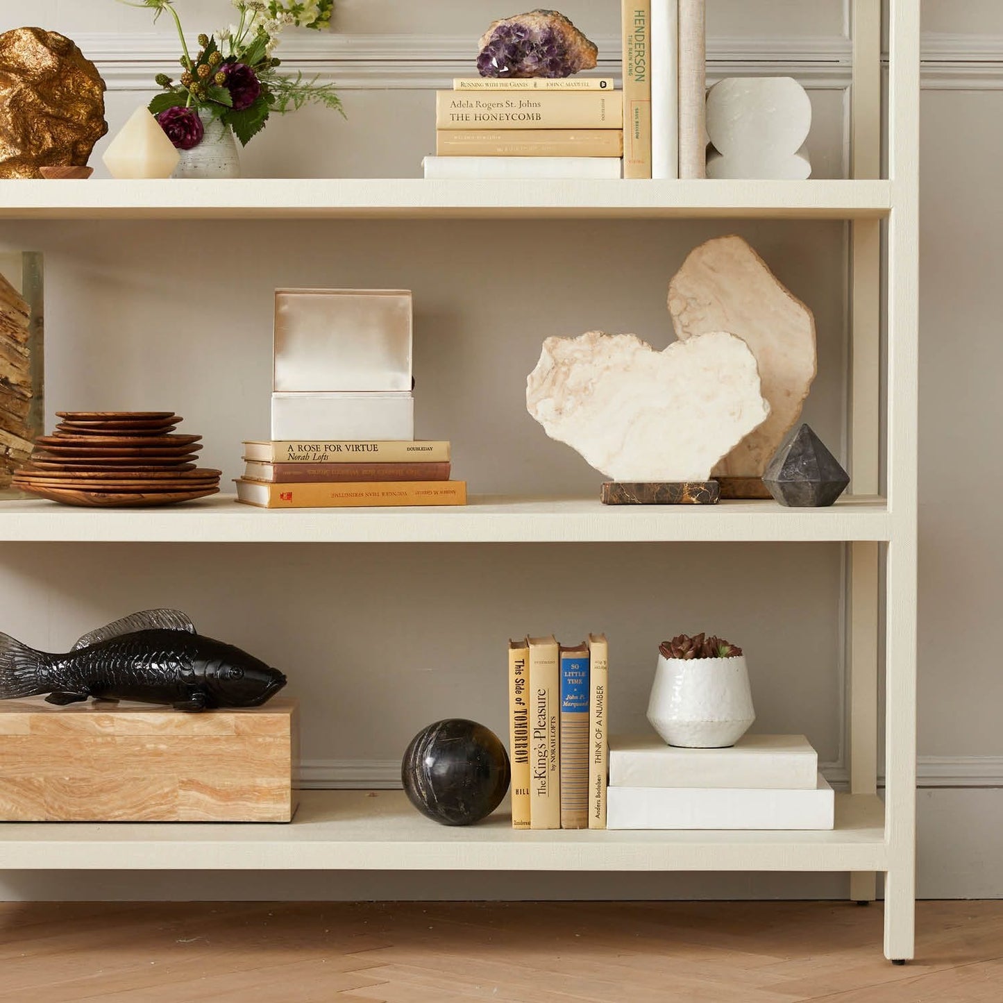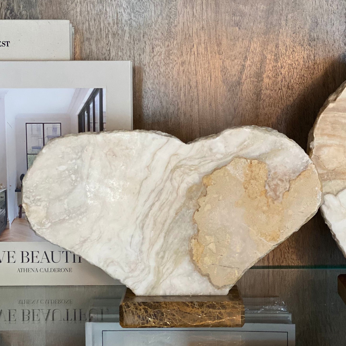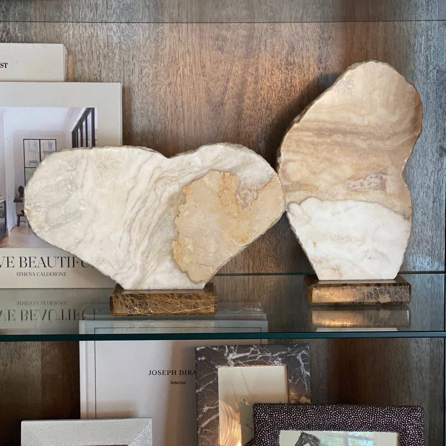 The Kalani Sculpture in Crystal and Snake Stone from Made Goods feature horizontally or vertically oriented slab sculptures with raw edges fashioned from crystal stone. The polished bases are made from contrasting stones.