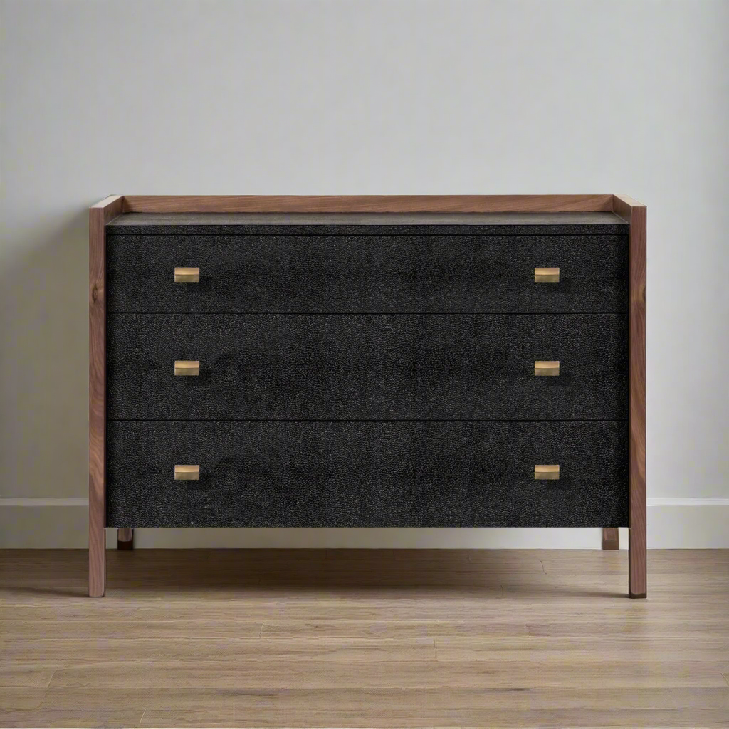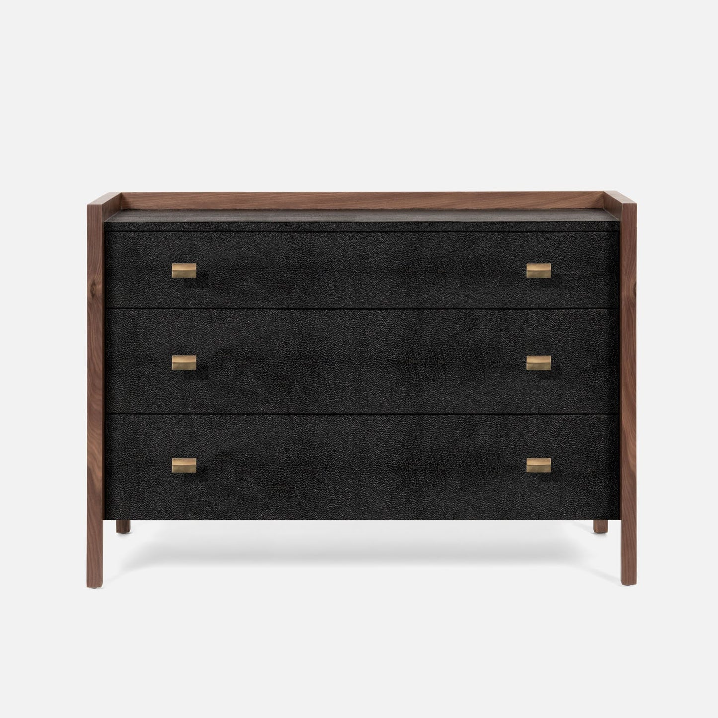 Made Goods 48" Kennedy Dresser in Black Vintage Faux Shagreen and Walnut Veneer features a luxurious faux shagreen texture and is framed by a raised veneer border. This stylish chest features three self-closing drawers for the ultimate in storage versatility.