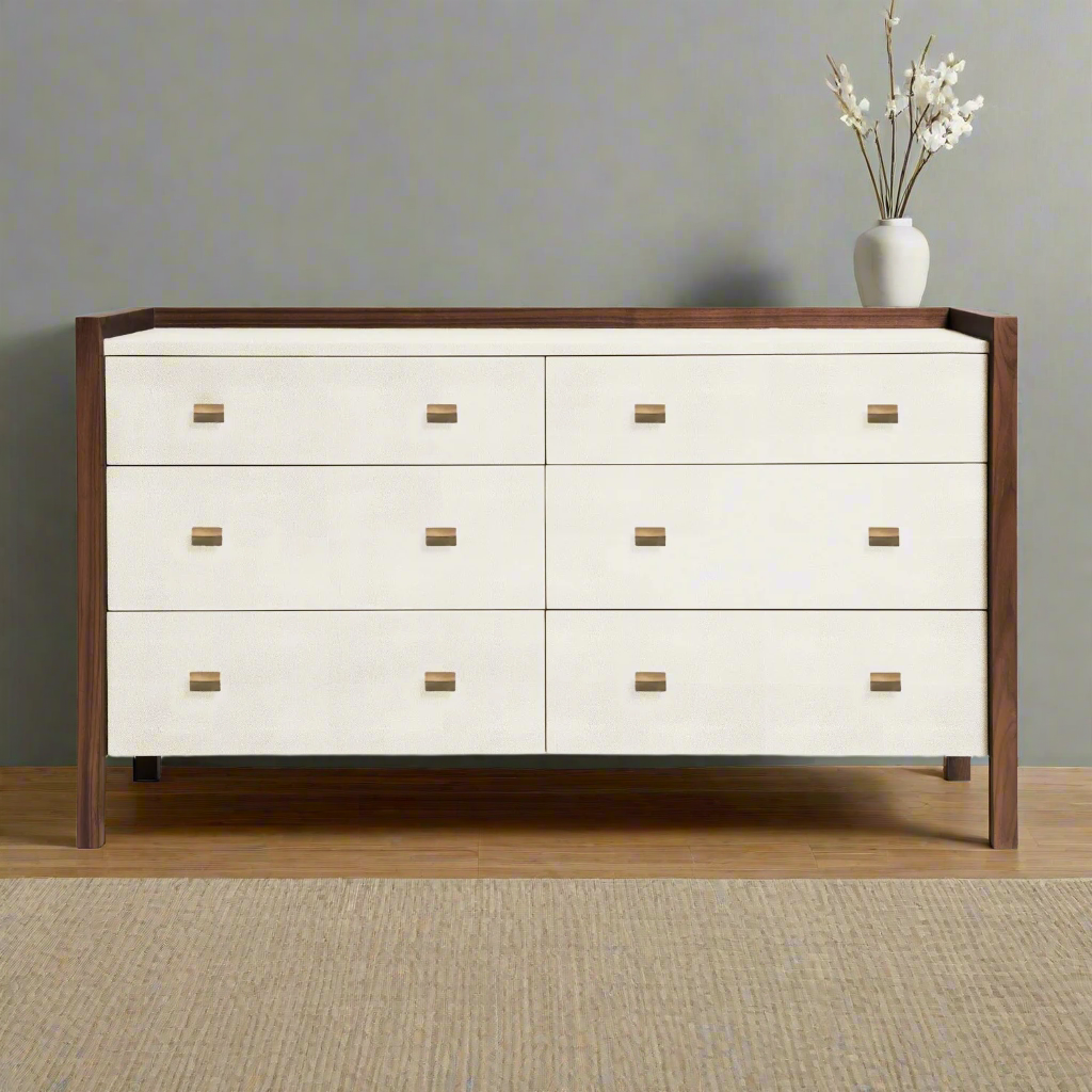 Made Goods 60" Kennedy Dresser in Pristine Vintage Faux Shagreen and Walnut Veneer showcases a faux shagreen texture and is framed by a raised veneer border. This retro dresser features six self-closing drawers for the ultimate in storage versatility.