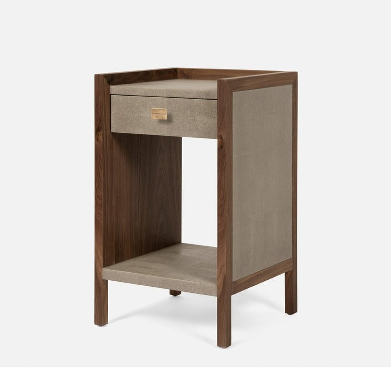 Capture unique shapes and chic functionality for your home with the Kennedy Single Nightstand in Castor Gray Vintage Faux Shagreen and Walnut Veneer from Made Goods furniture. Framed by a raised veneer border, the Kennedy offers a drawer and a shelf to organize all your essentials The neutral hue and luxurious finish complement the retro feel of this compact side table.
