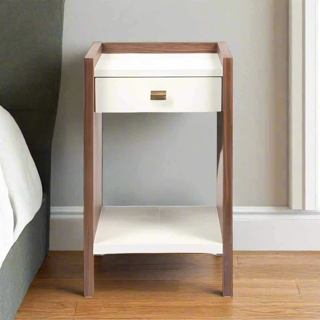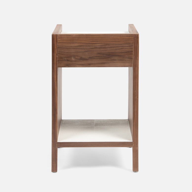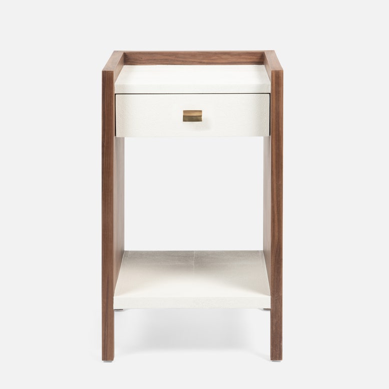 Bring unique shapes and chic functionality to your home with the Kennedy Single Nightstand in Pristine Vintage Faux Shagreen and Walnut Veneer from Made Goods furniture. Framed by a raised veneer border, the Kennedy offers a drawer and a shelf to organize all your essentials The neutral hue and luxurious finish complements the retro feel of this compact accent table.