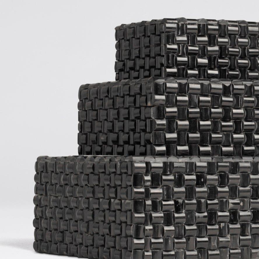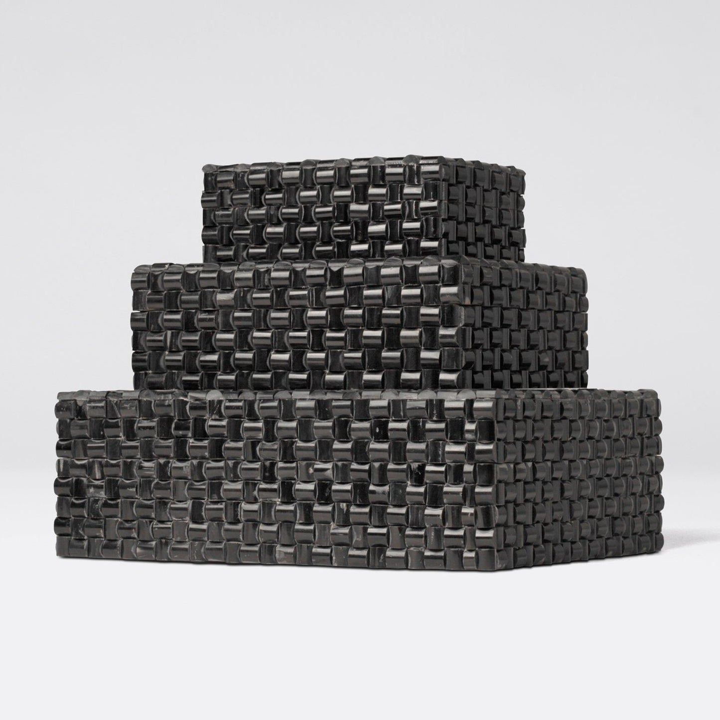 Organize your essentials with elegance using the Kester Box Set Black Bone from Made Goods. This set features intricately carved bone or horn in the form of bamboo, with a cream linen interior for a luxurious touch.