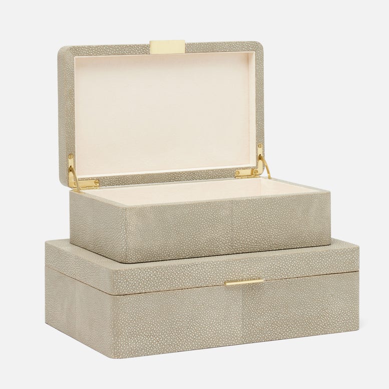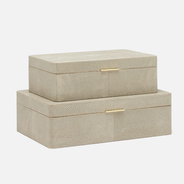 Crafted with elegance and sophistication, the Kiraz Box Set in Sand Faux Shagreen adds luxury to any space. The hinged lid with a brass tab opens to a suede interior, balancing style and functionality.