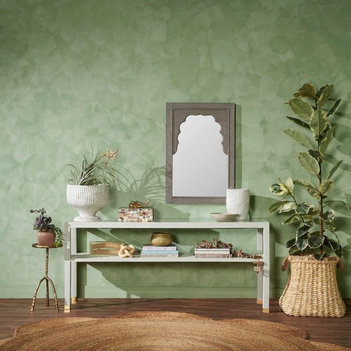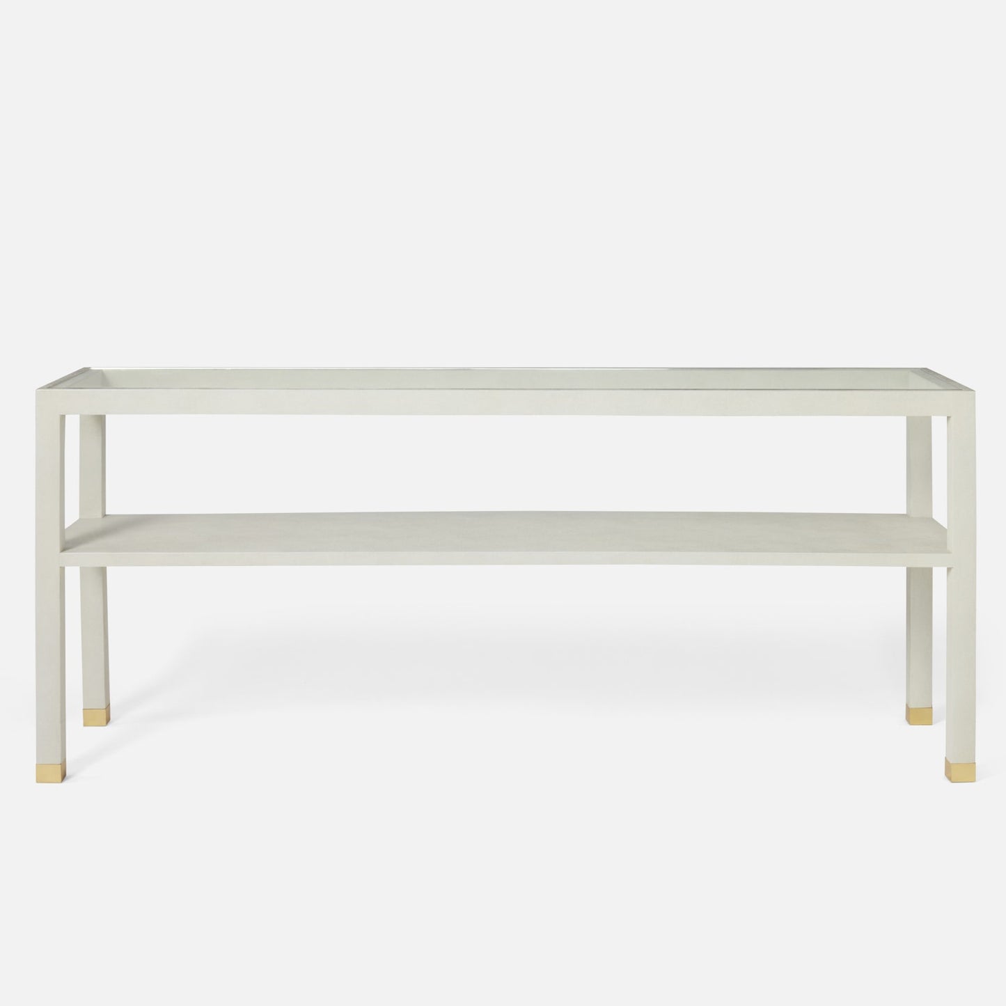 The Lafeu Console in Blanc Realistic Faux Shagreen from Made Goods features a simple, square frame fully finished in luxurious faux shagreen. A glass top reveals the piece's lower shelf, and the table's feet are capped in brass for a chic finishing detail.