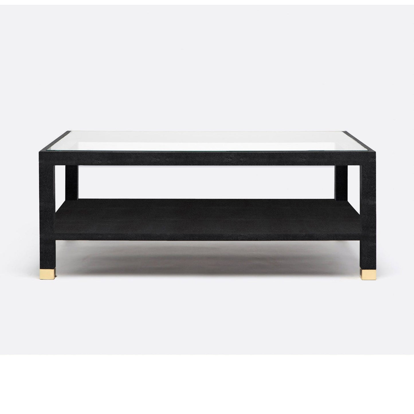 The Lafeu Rectangle Coffee Table in Black Faux Shagreen from Made Goods has a rectangle frame fully finished in a luxurious faux shagreen finish. A glass top reveals the piece’s lower shelf, and the table’s feet are capped in brass for a chic finishing detail.