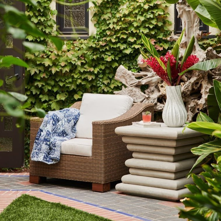 The Made Goods Lana Vase showcases a textured, organic shape with unique ridges that add a captivating texture to the piece. This sizable, handcrafted vase is glazed ceramic and can be displayed alone or grouped for a bold effect on any tabletop, shelf, or desktop.