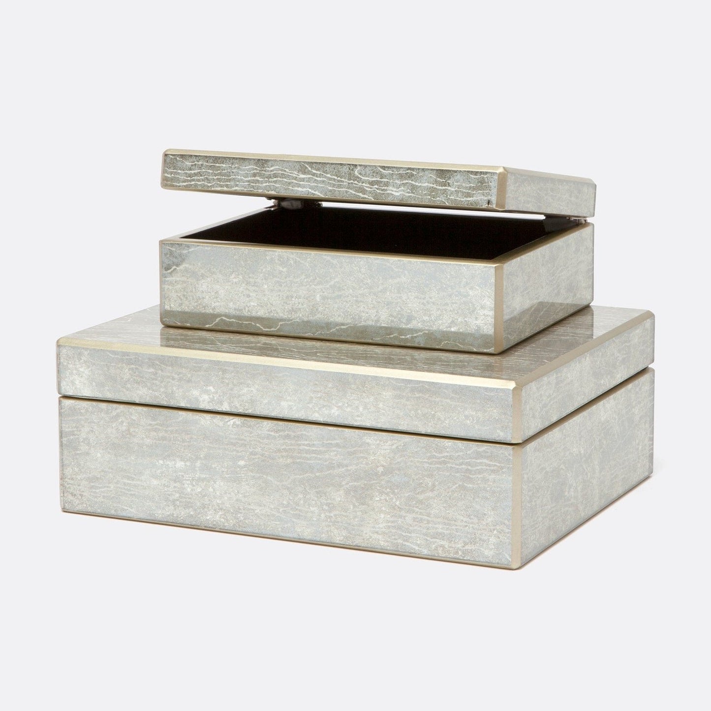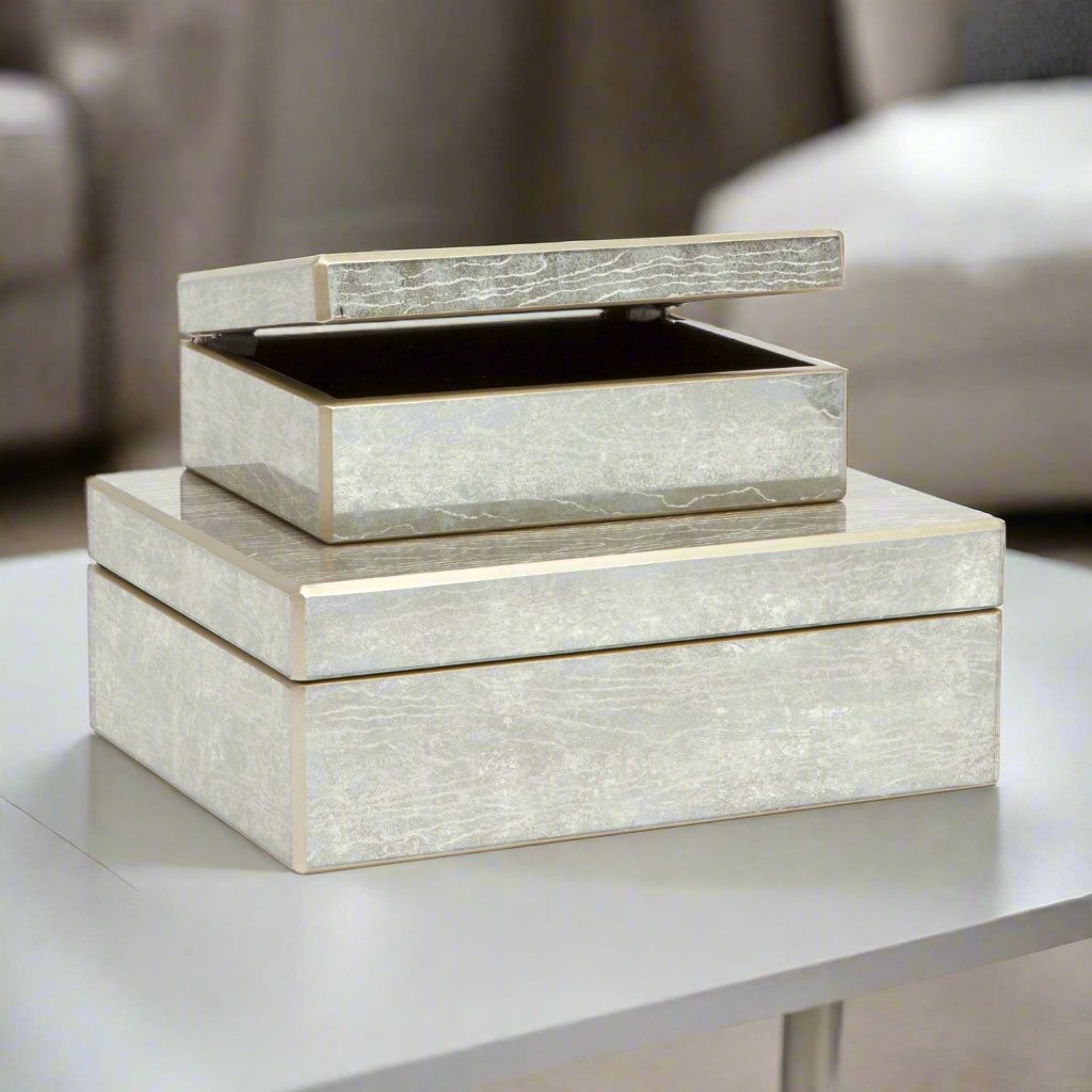 The Lark Box Set in Silver Woodgrain Mirror from Made Goods boasts woodgrain-mirrored boxes, complete with beveled edges and contrast trim, adding a touch of sophistication to any space.