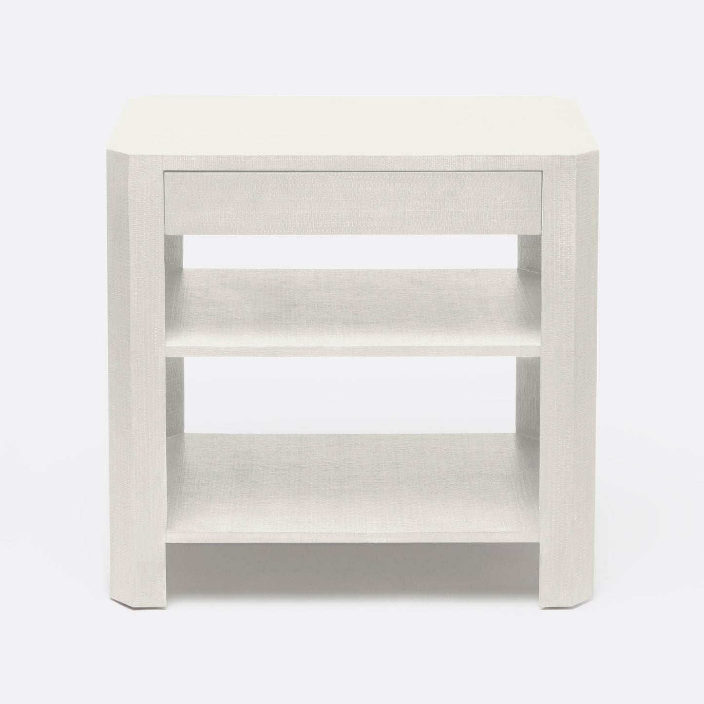 Made Goods Lena Double Nightstand in Pristine white showcases a self closing drawer for storage and two lower shelves for books and decorative items. Finished in a contemporary faux raffia, this modern side table can also be used as a living room side table, adding stylish functionality to any decor scheme.