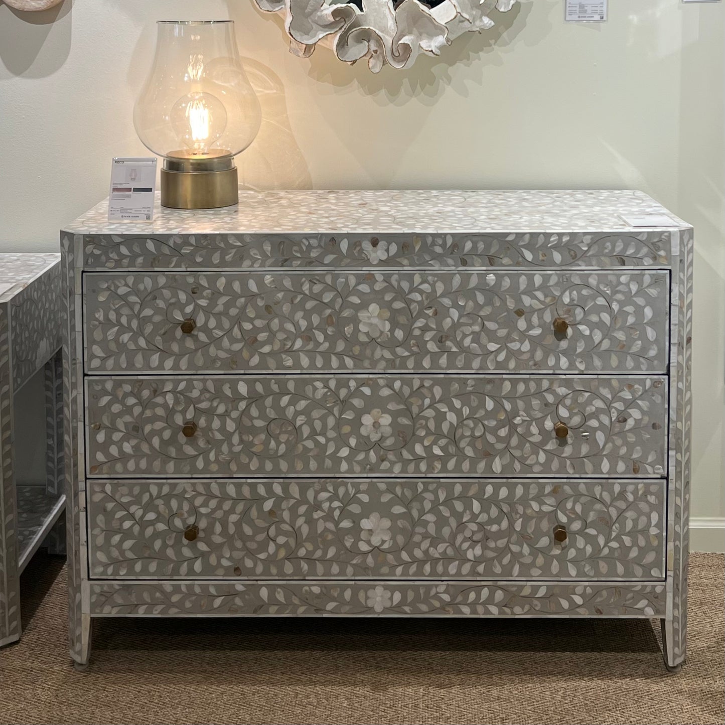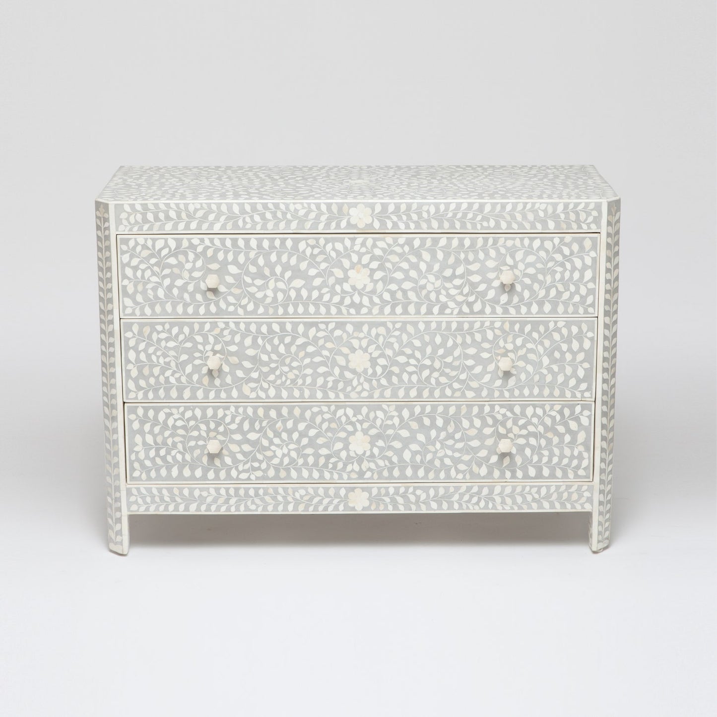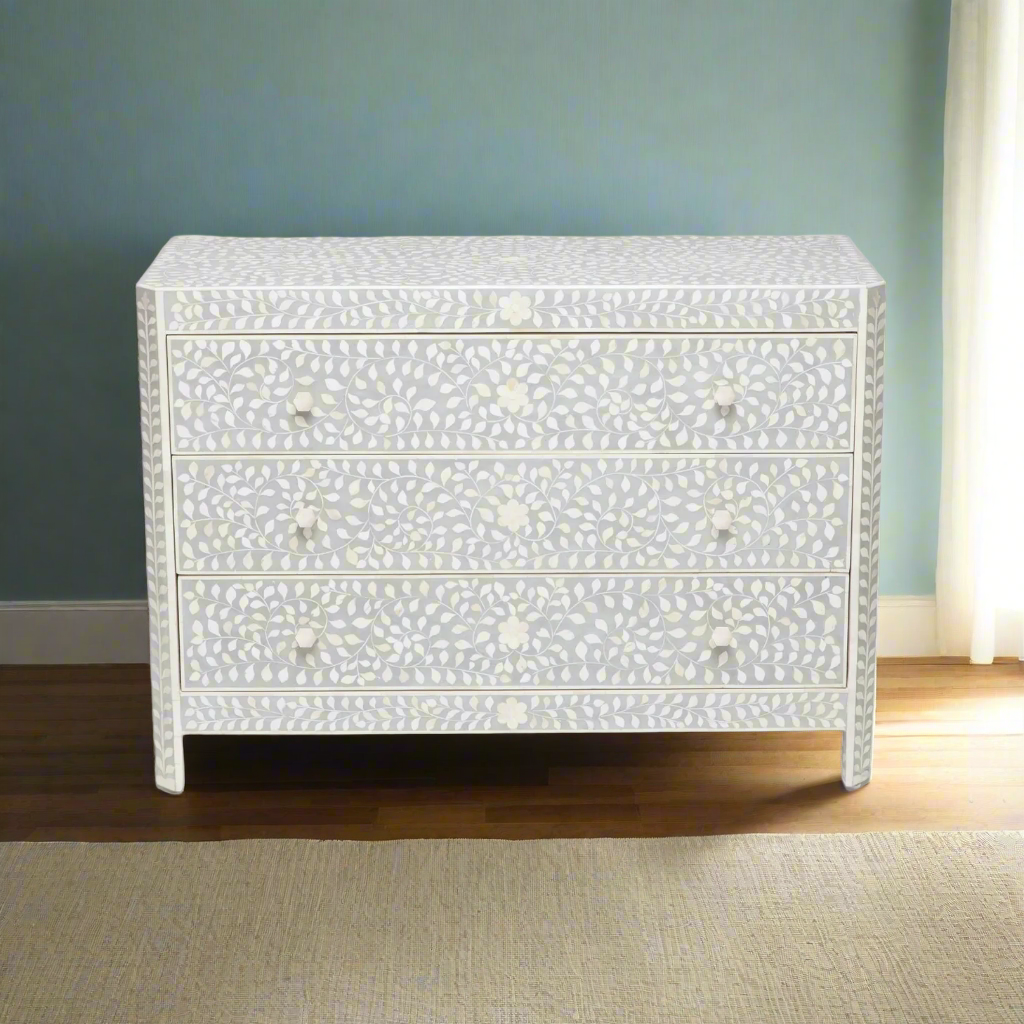 The Lexi Dresser Natural Bone Gray Resin from Made Goods features clipped corners and a beautiful design, highlighting a simplified and updated Indian pattern. Created with camel bone painstakingly hand-set in resin. The simple structure of the piece allows the craftsmanship to shine while highlighting a worldly sensibility.