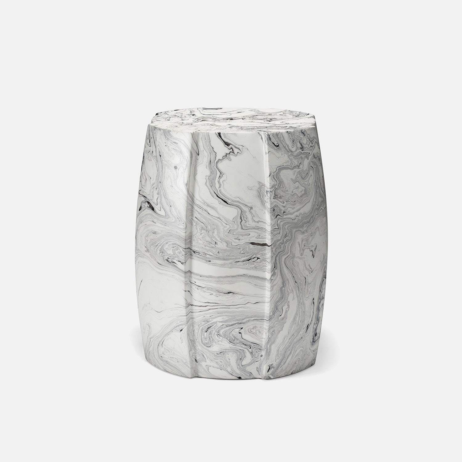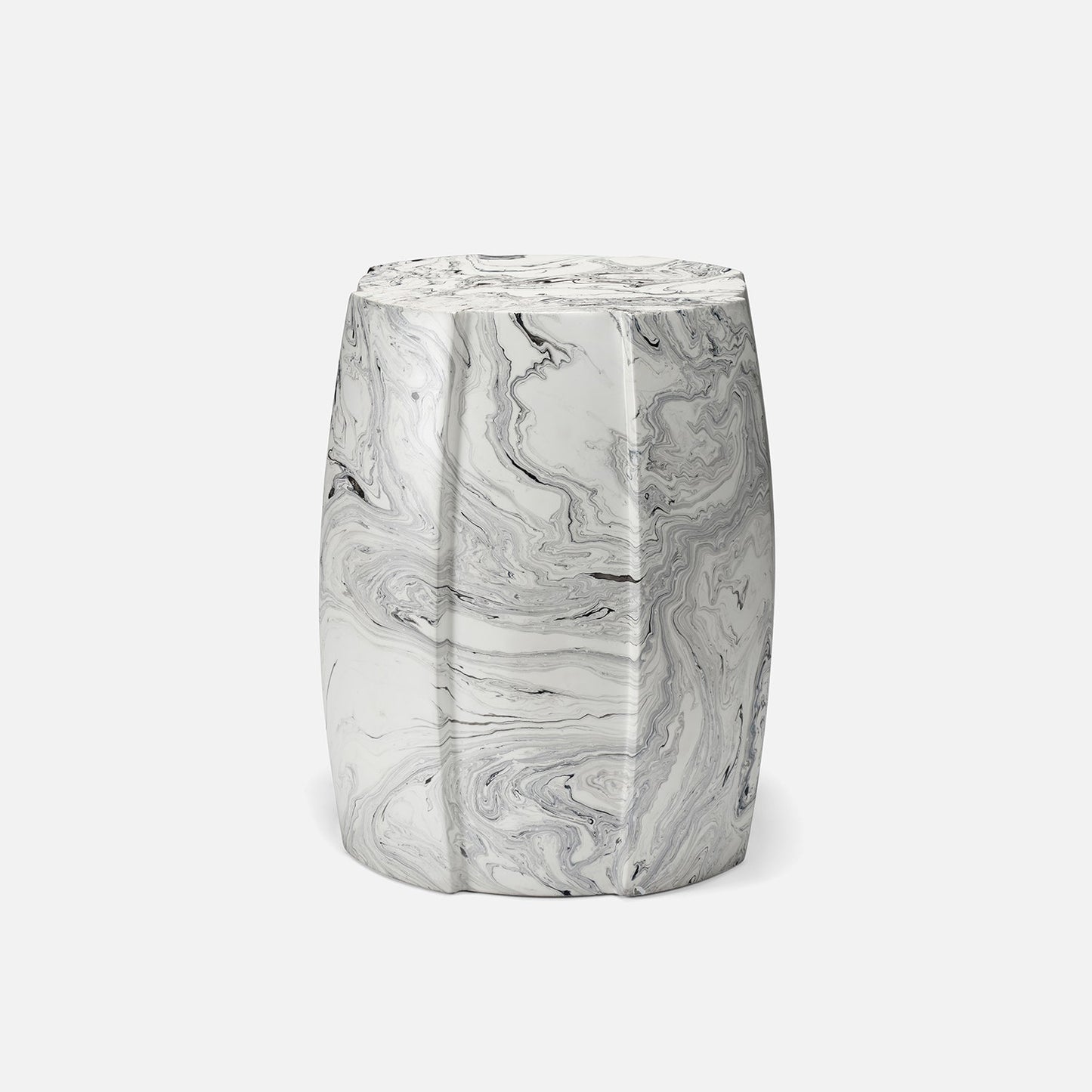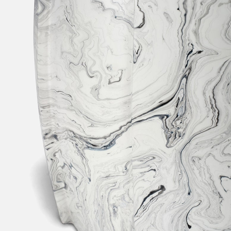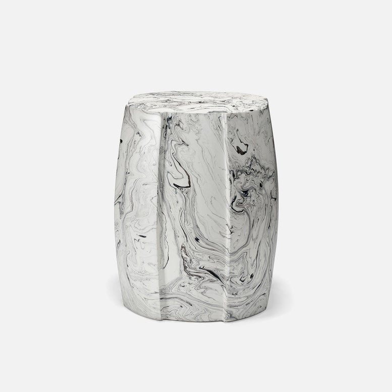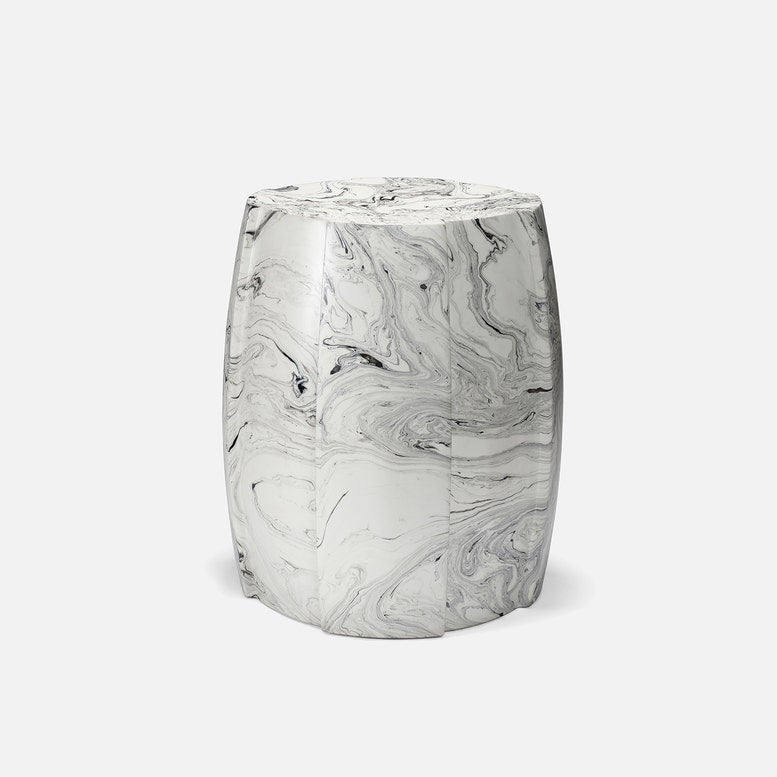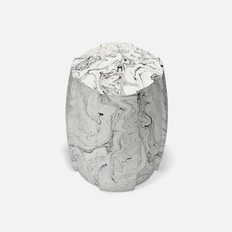 Crafted from matte resin with a variety of swirled finishes, the Linden Stool in White Swirl Resin by Made Goods exemplifies refined artistry. Each piece is uniquely hand-swirled, resulting in distinctive patterns that range from bold and dramatic to delicate and understated.