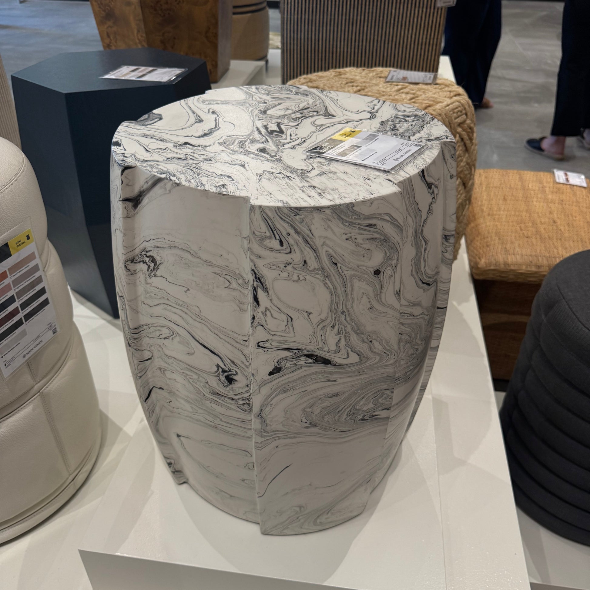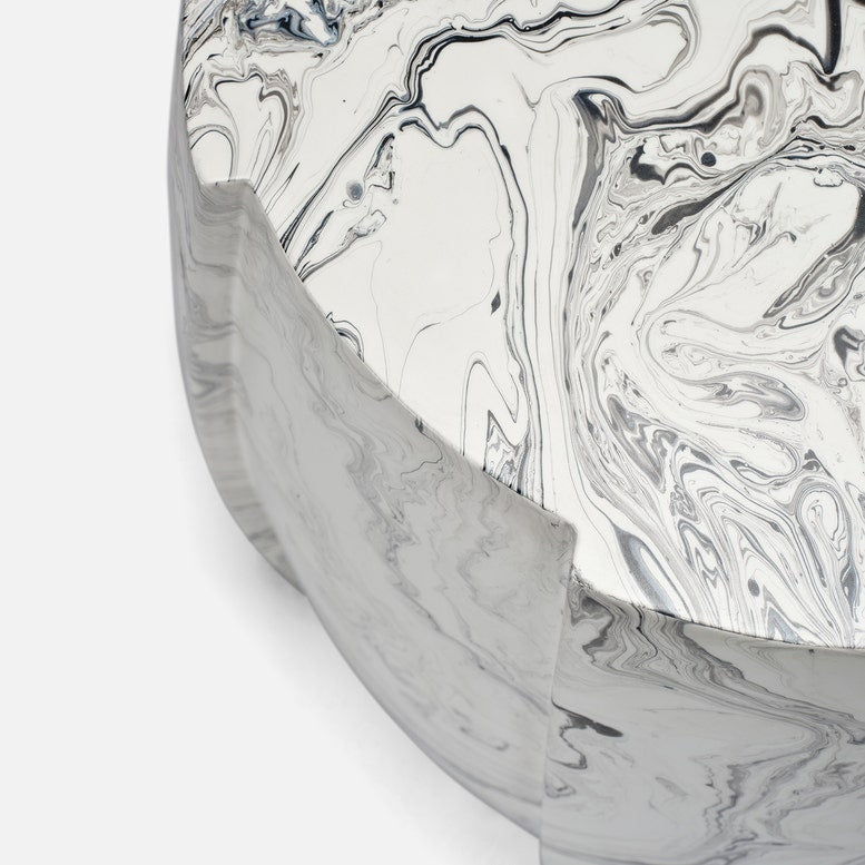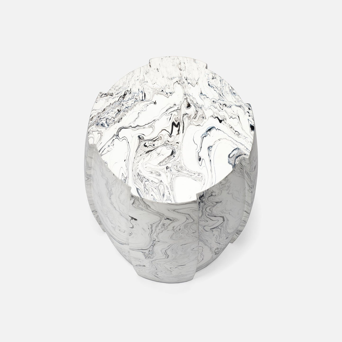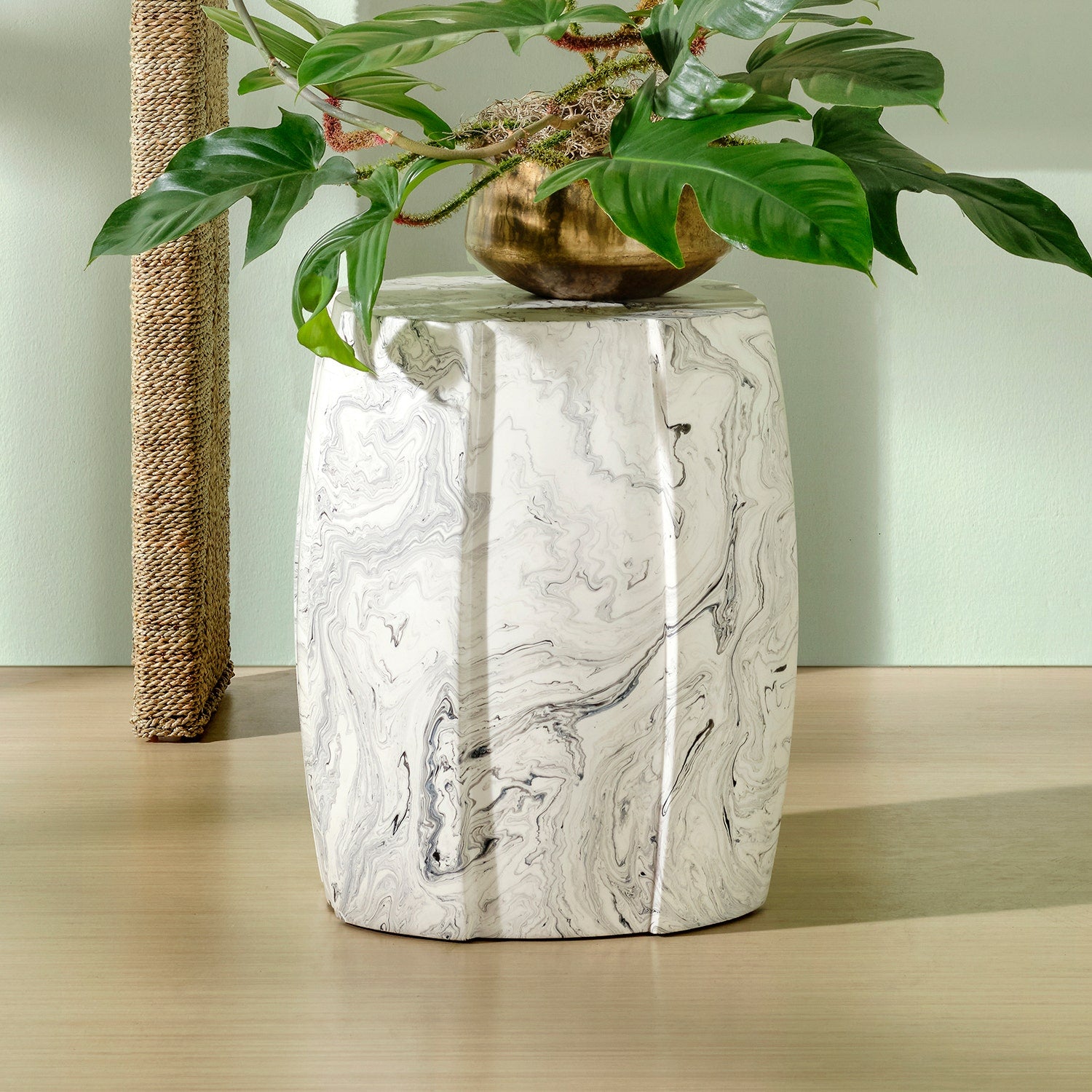 Crafted from matte resin with a variety of swirled finishes, the Linden Stool in White Swirl Resin by Made Goods exemplifies refined artistry. Each piece is uniquely hand-swirled, resulting in distinctive patterns that range from bold and dramatic to delicate and understated.