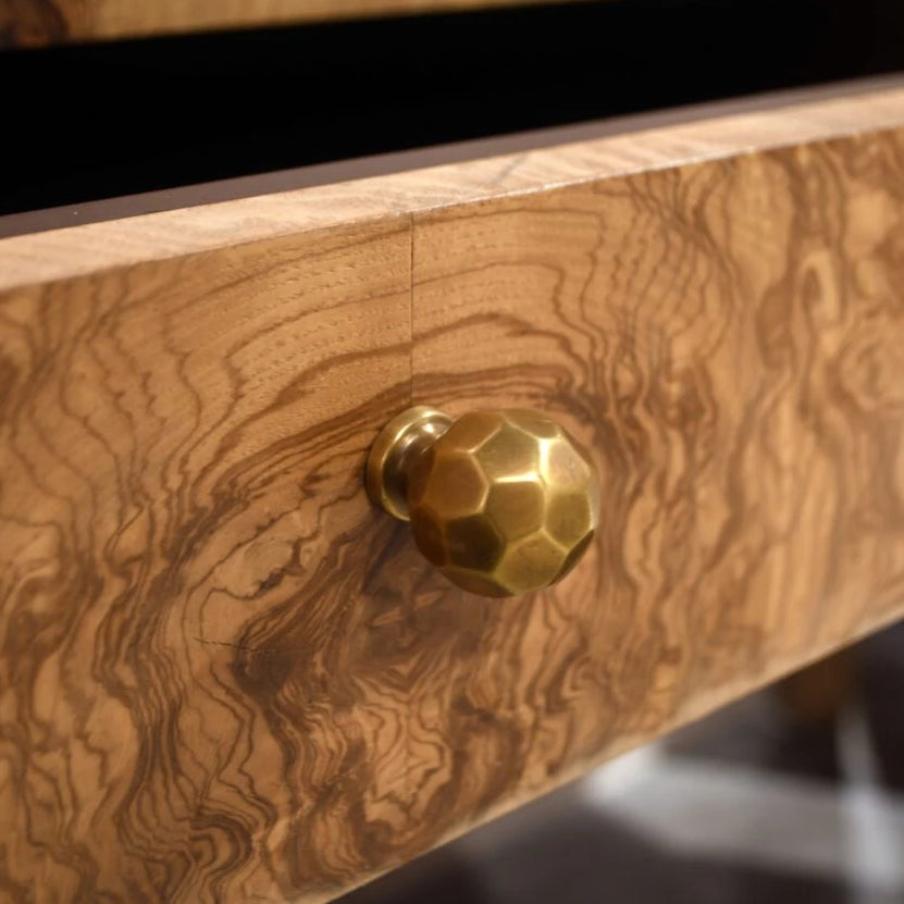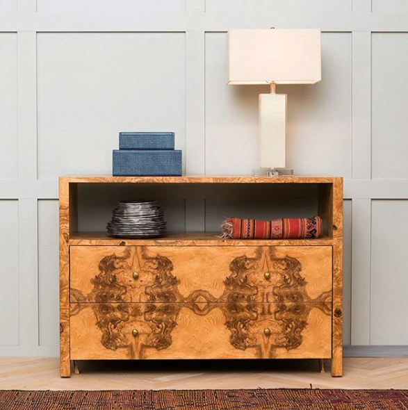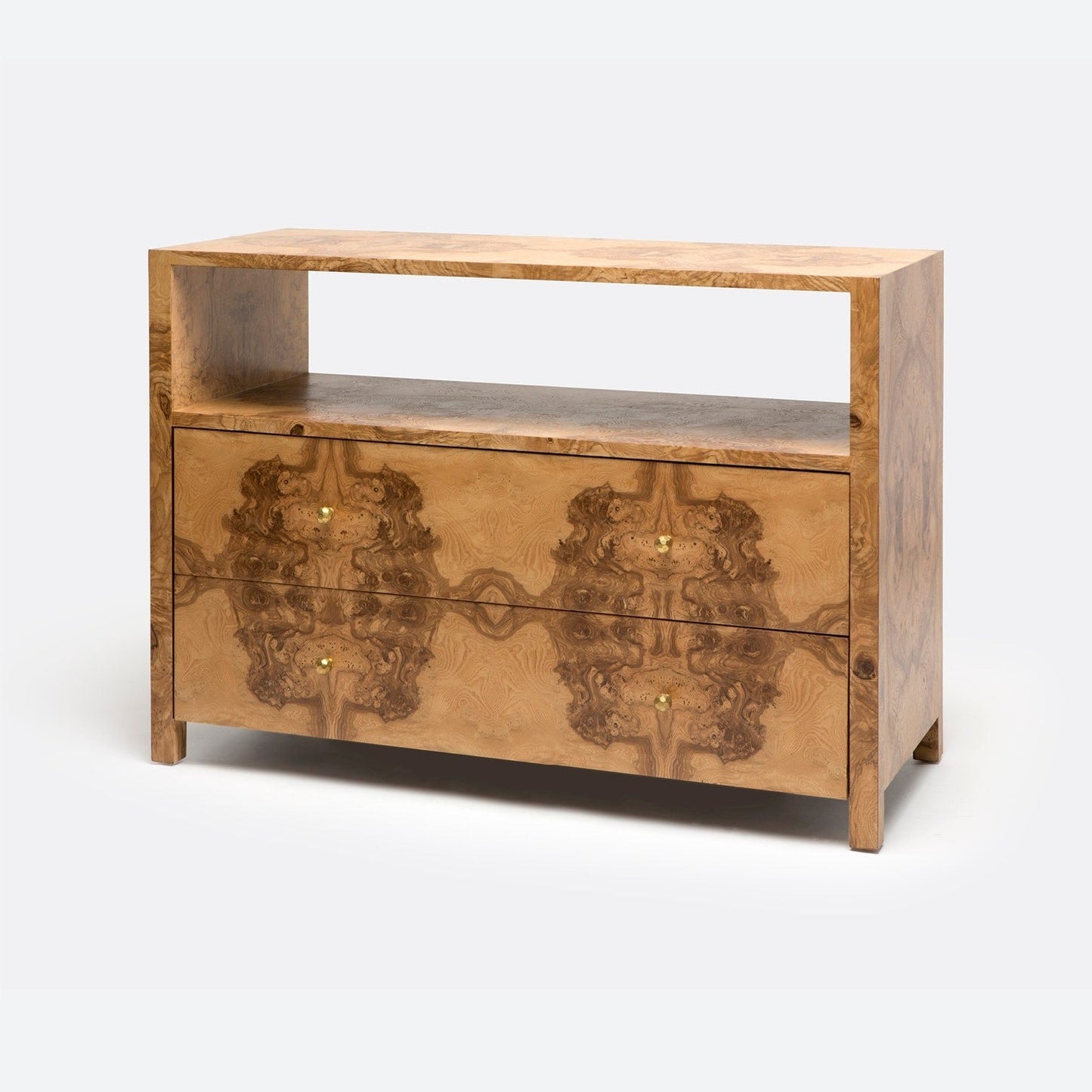 The Lindsey Buffet 48" in Olive Ash Veneer from Made Goods features vibrant patterns that play nicely on the simplistic silhouette which features an open shelf and two bottom drawers.