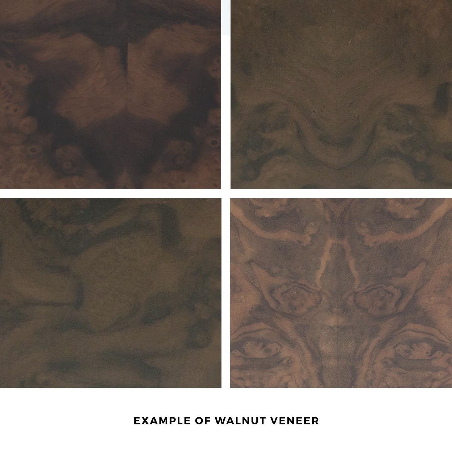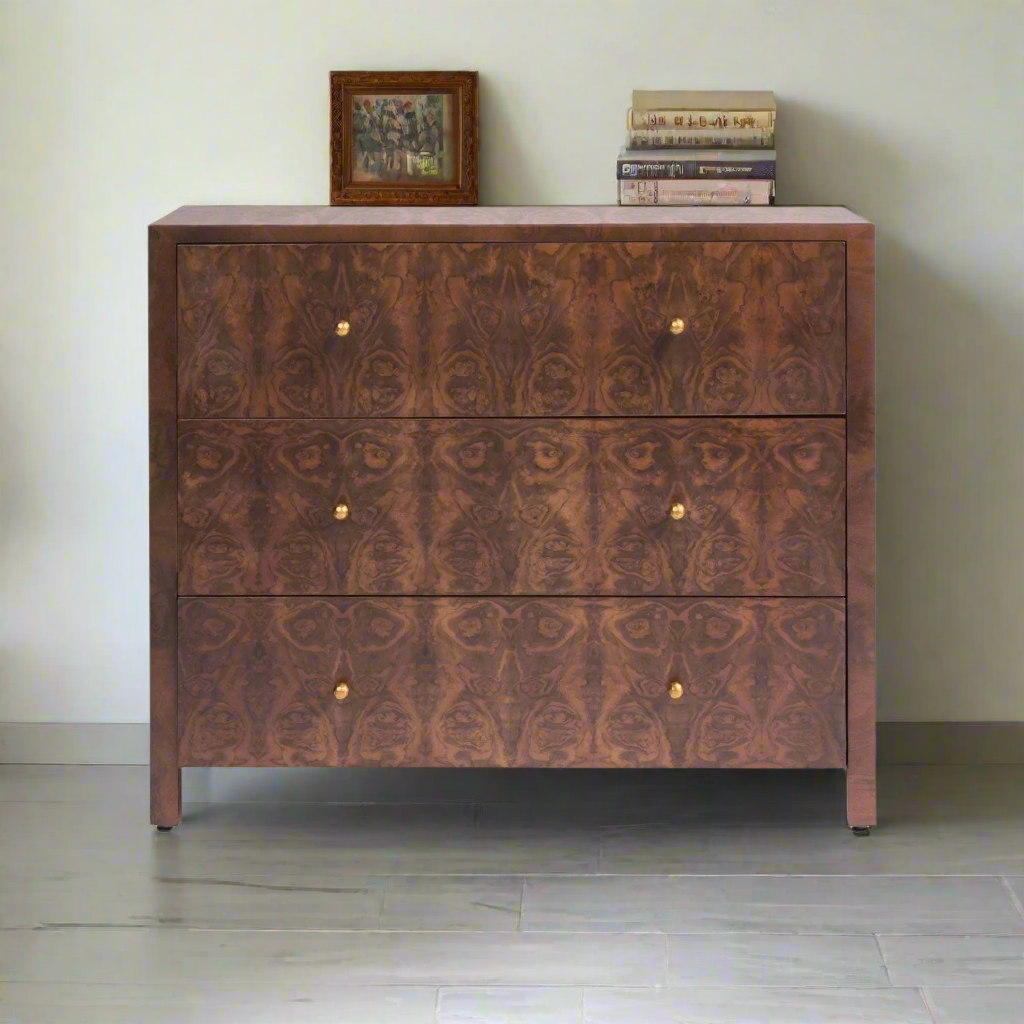 Straightforward silhouettes let vibrant patterns become the focal point of each dynamic piece of the Lindsey 36” Dresser in Walnut Veneer from Made Goods. Detailed variation highlights burled wood veneer, and faceted brass hardware adds a polished touch.