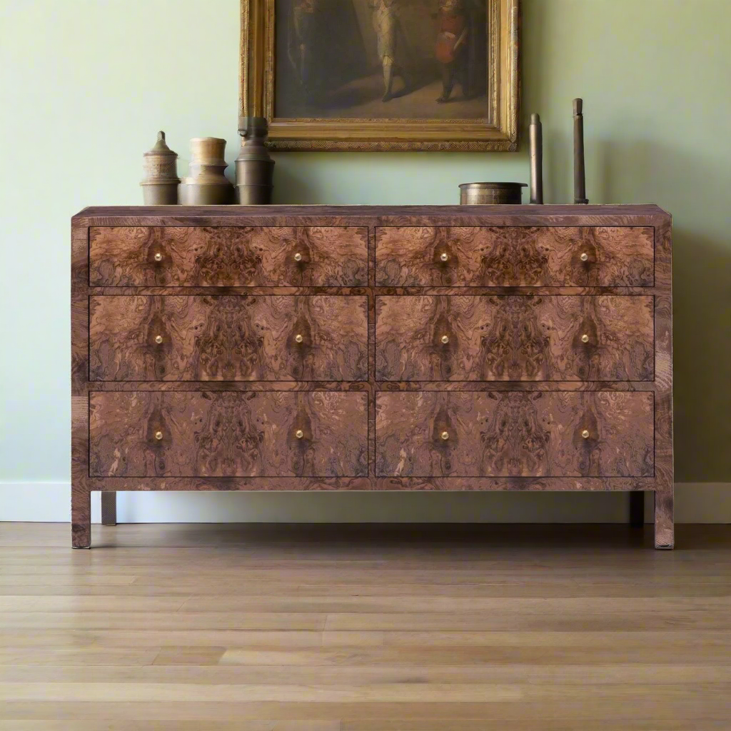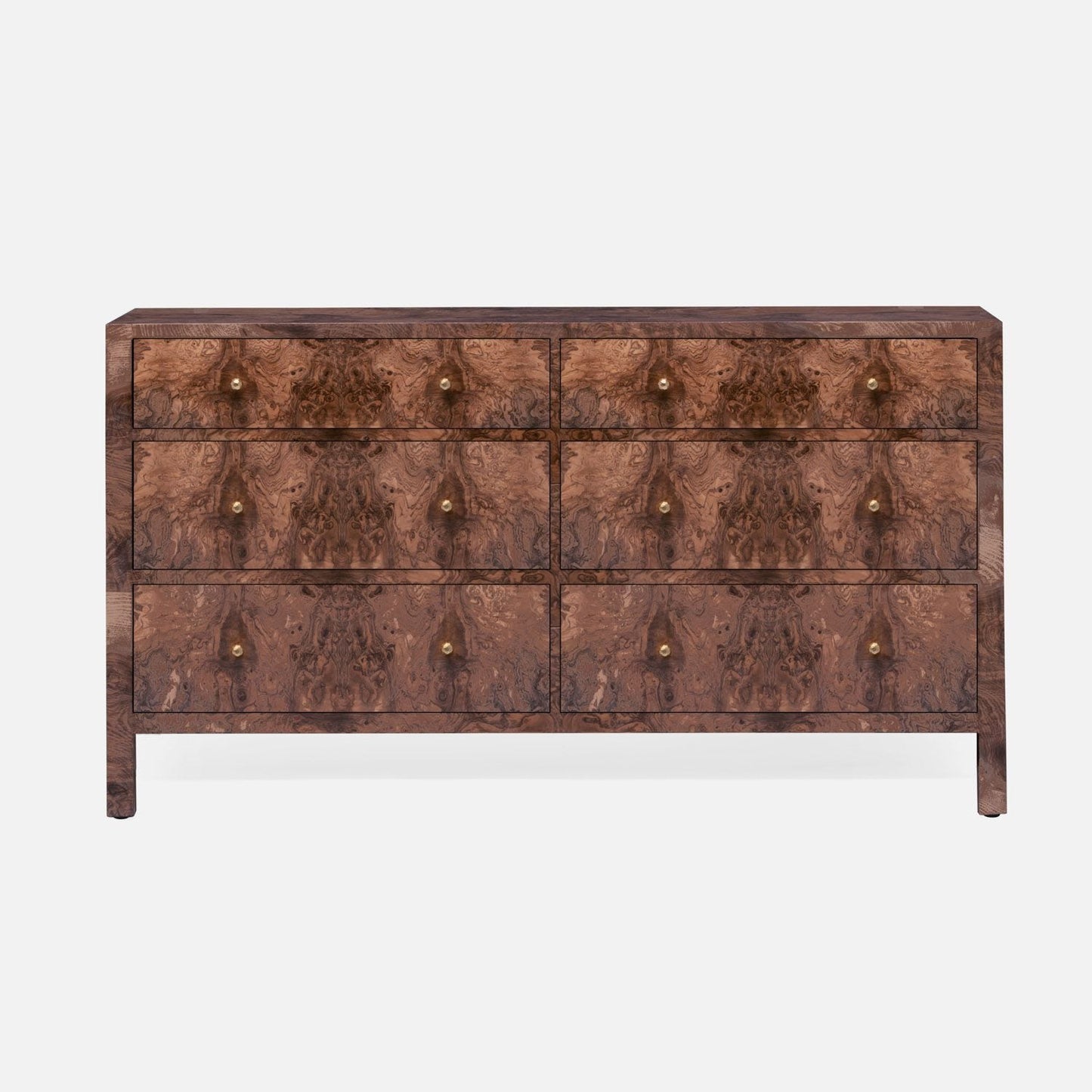 Straightforward silhouettes let vibrant patterns become the focal point of each dynamic piece of the Lindsey 60” Dresser in Walnut Veneer from Made Goods. Detailed variation highlights burled wood veneer, and faceted brass hardware adds a polished touch.