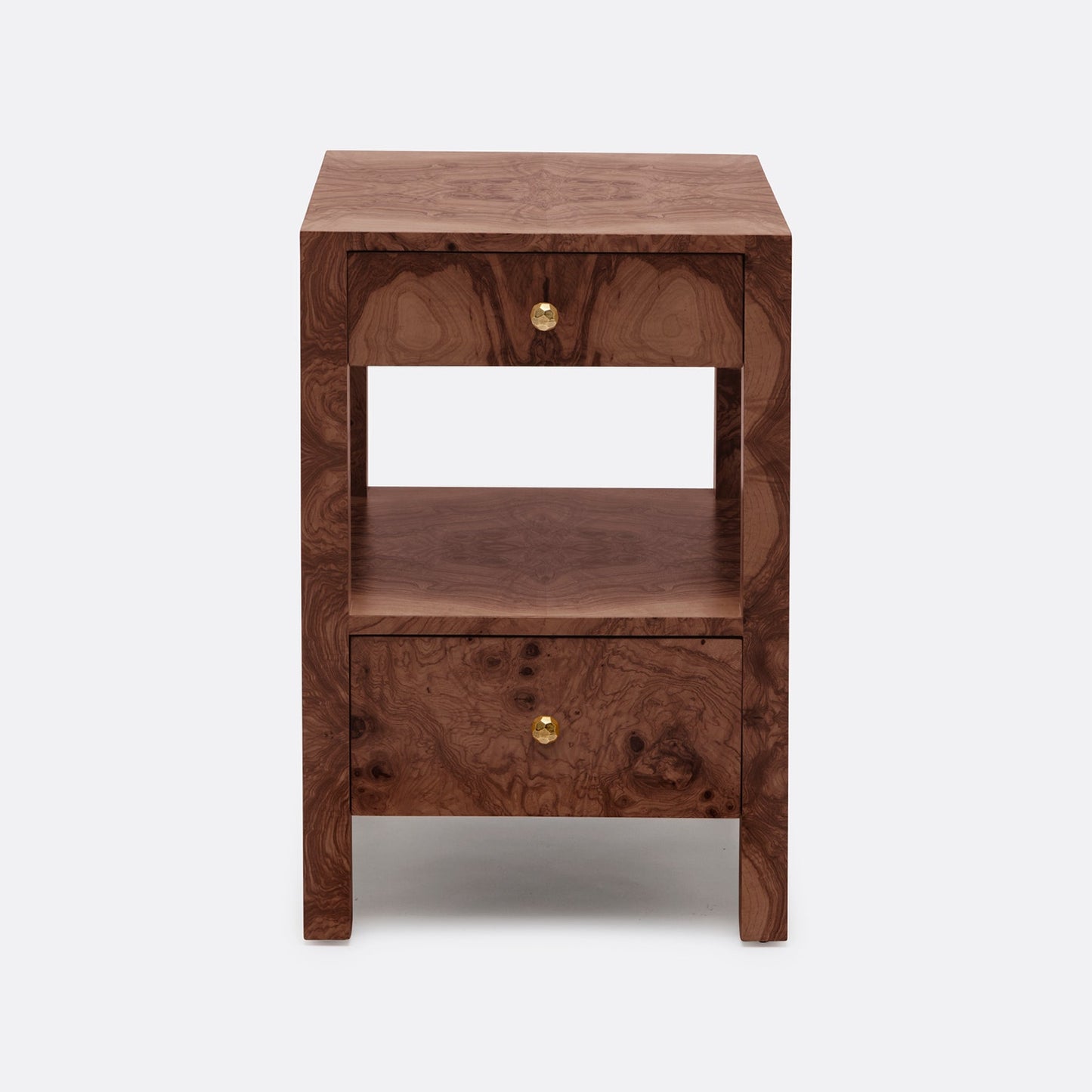 The Lindsey Single Nightstand in Walnut Veneer from Made Goods offers a clean silhouette allowing the vibrant pattern of the burled wood to shine through. The Lindsey's detailed variation highlights the faceted brass hardware creating a polished look. This item is handcrafted and may show slight variation in size from one piece to another.