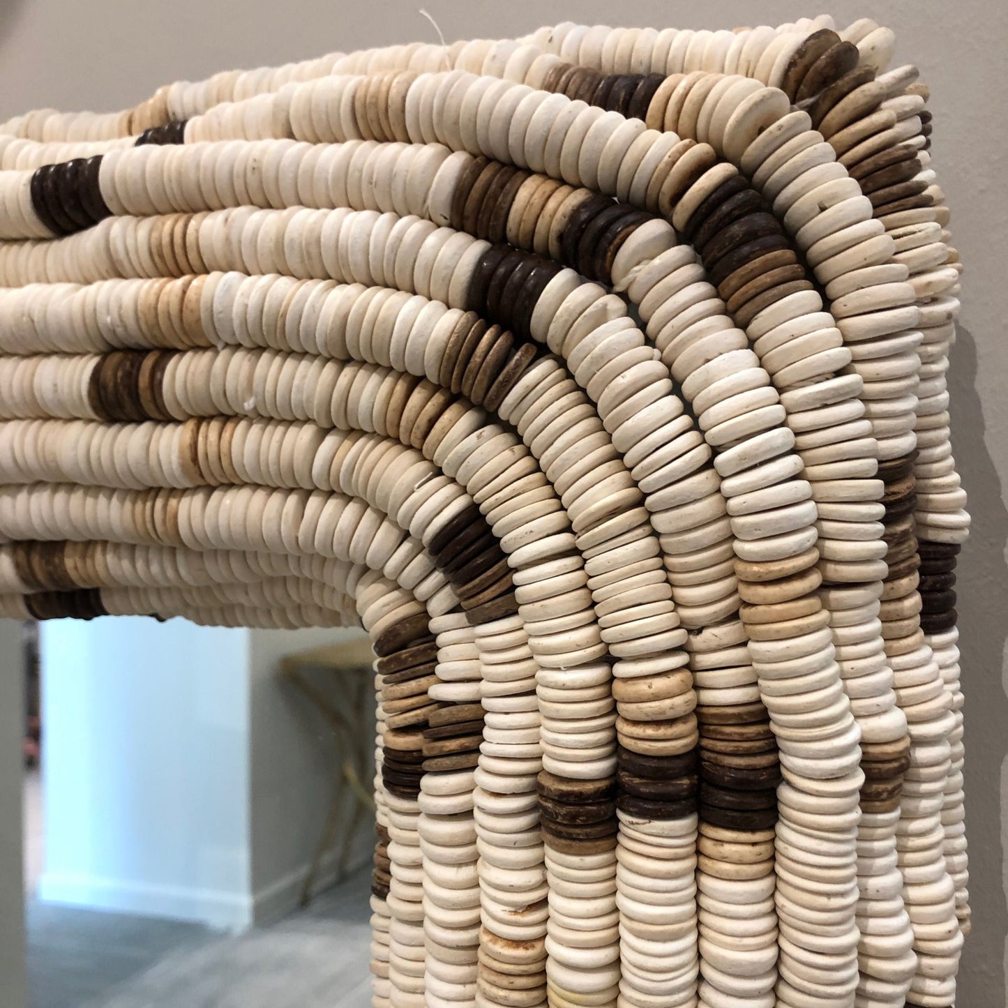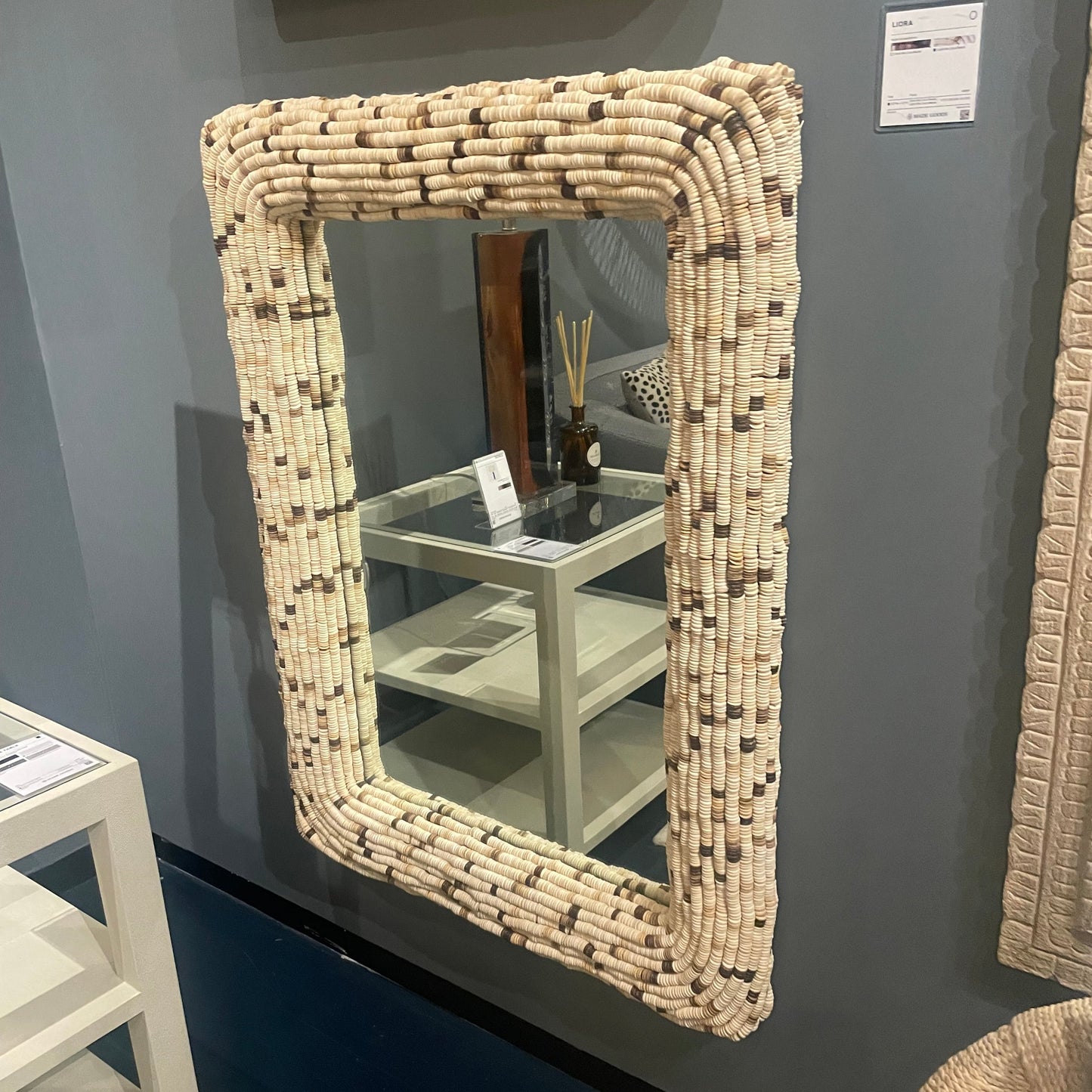Add a tactile element to a room that's purely organic. Large coco beads in a neutral mixed palette frame the rectangular Liora Mirror in Light Mix Coco Beads from Made Goods for a delicate balance of complexity and warmth.