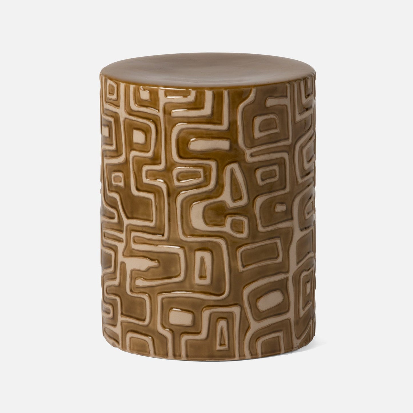 The natural clay Loman Stool in Olive Ceramic from Made Goods takes on a pop art feel, thanks to the raised pattern on its exterior surface. The graphic '60s-inspired design and contrast-glazed top give the stool's simple cylindrical shape some wonderfully winsome character.