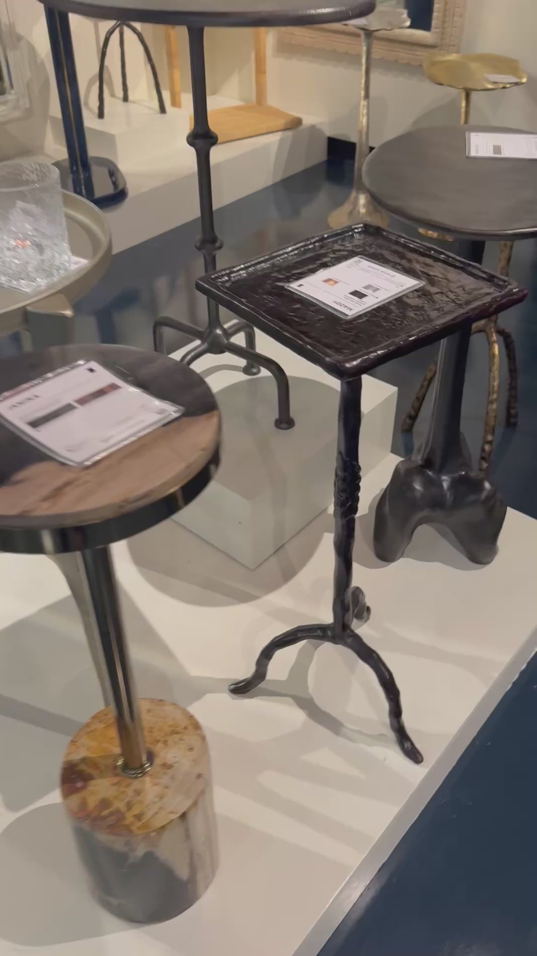 Crafted with a chunky, textured tripod stand made of twisted iron, the Maddy Drinks Table in Bronze from Made Goods boasts a slender silhouette. Its square top and laurel leaf design elevate its character.