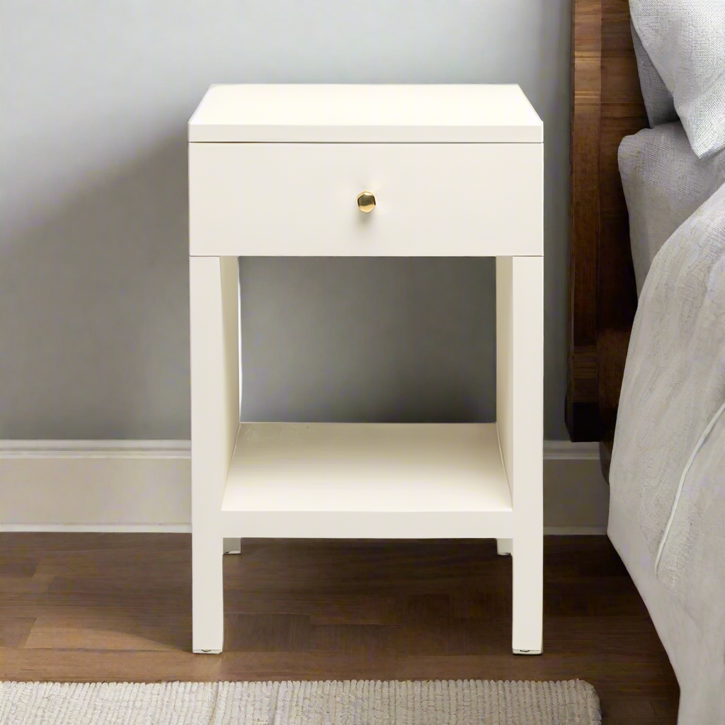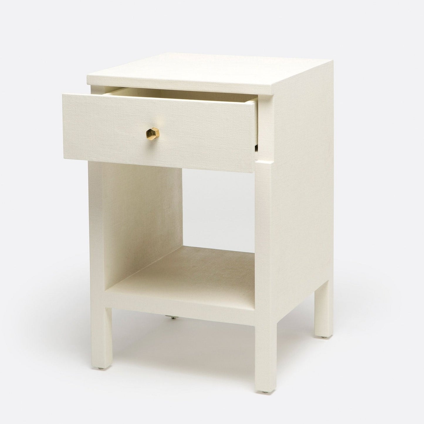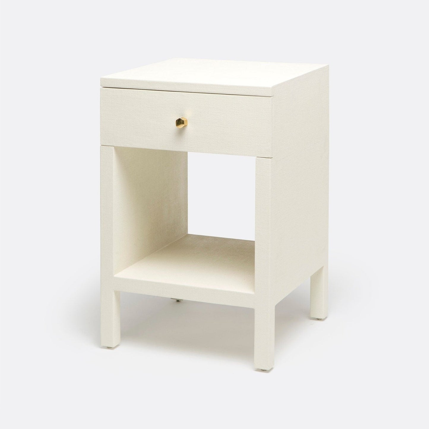 The Maris Single Nightstand in White Faux Belgian Linen from Made Goods takes a classic style and elevates it with simple yet elegant texture and sheen. Offering overlay drawer panels that extend all the way to the sides and an airy feel with raised feet, the Maris from Made Goods Furniture highlights traditional styling with thoughtful craftsmanship.