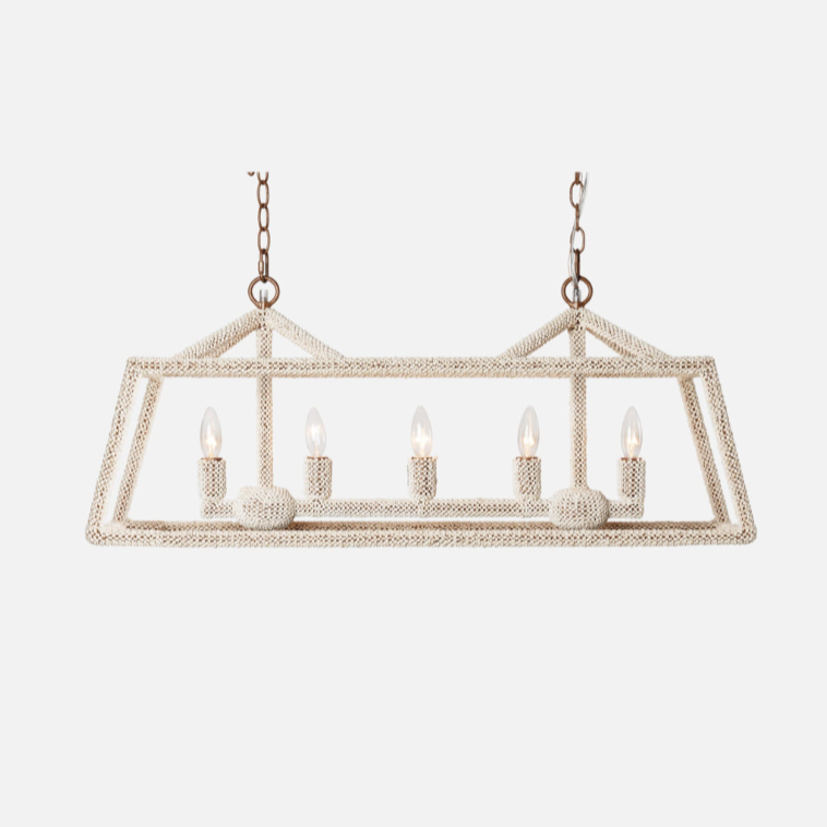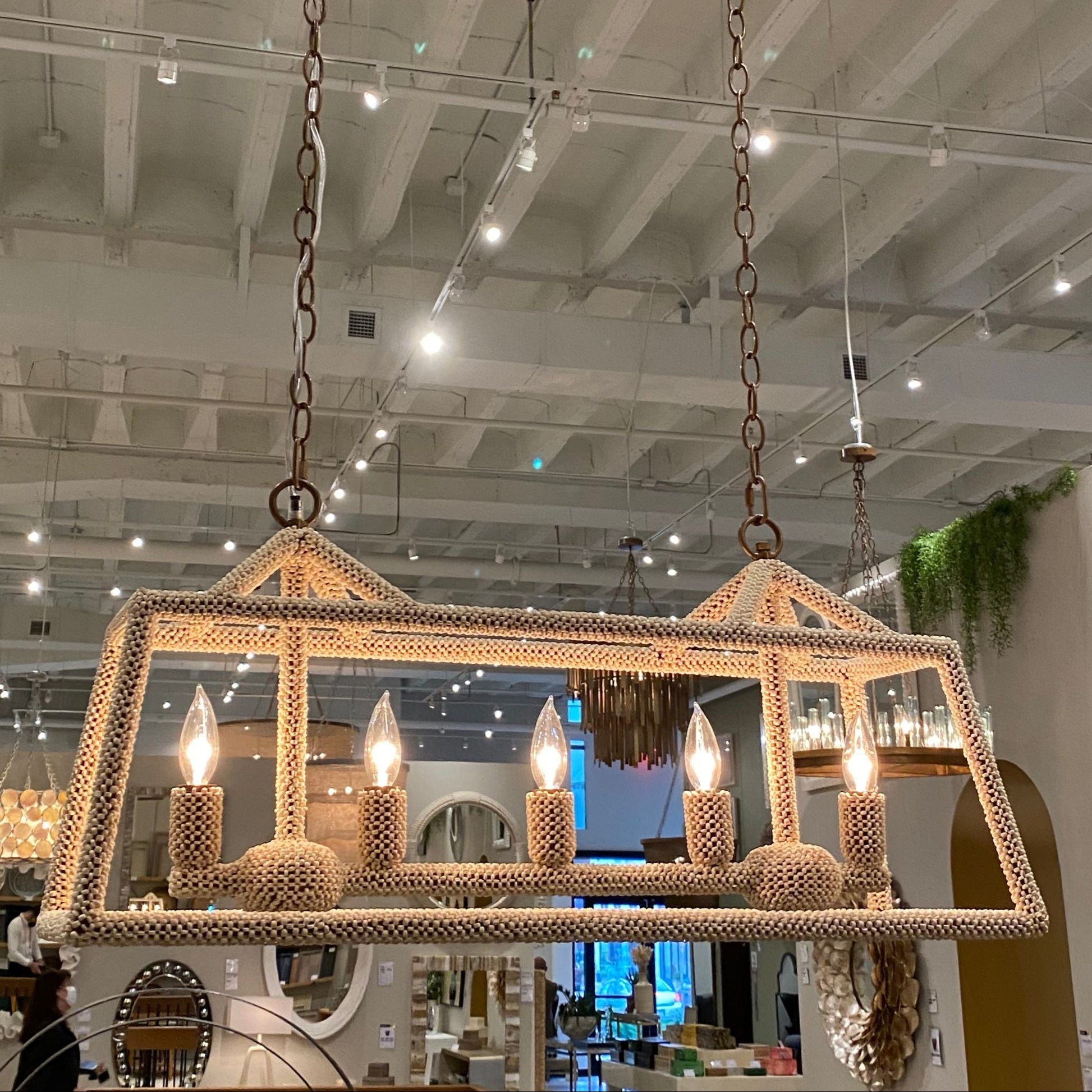 Crafted with care and expertise, the Rectangular Maritsa Chandelier from the Made Goods collection showcases a stunning open-frame design constructed of sturdy tarnished gold metal and adorned with delicate coco beads.