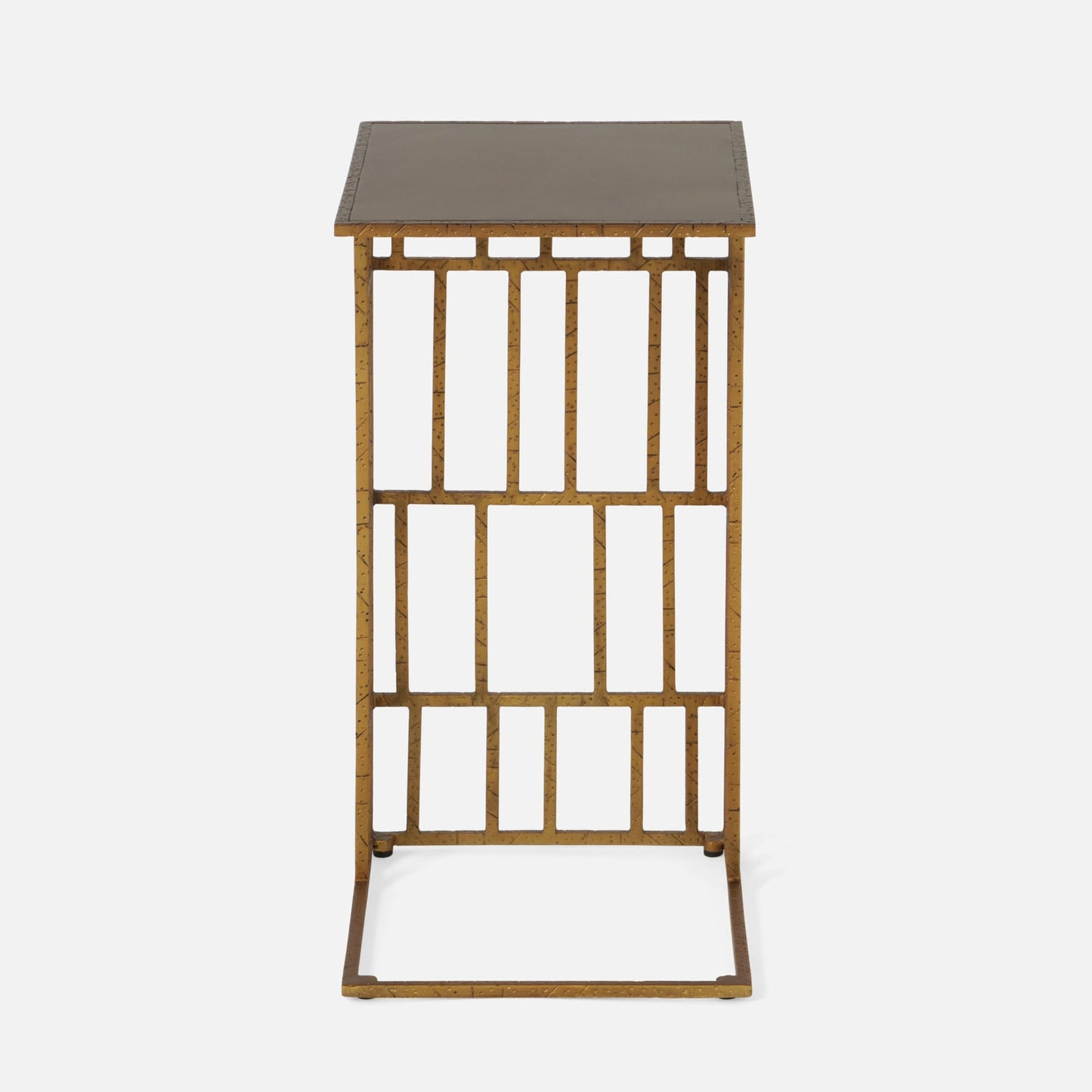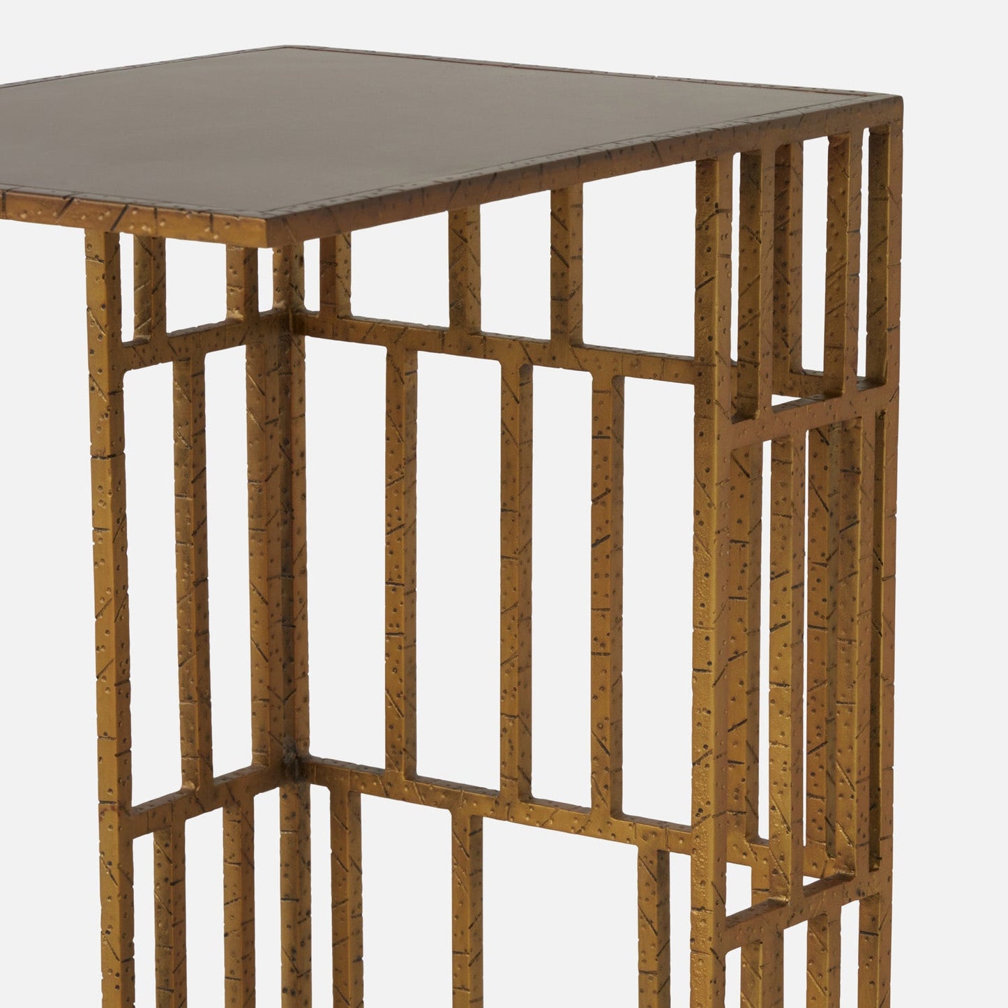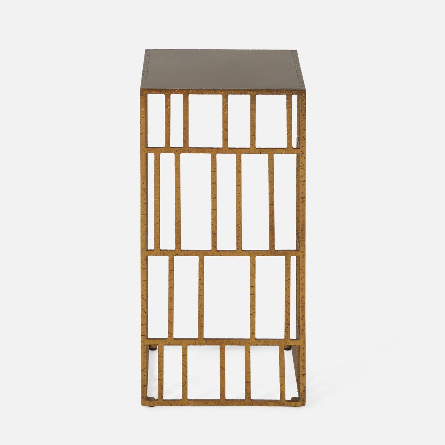 Art deco inspired the Melville Table in Aged Brass Iron from Made Goods features a distinctive design of geometric shapes in a simple yet sophisticated aged brass iron side table.
