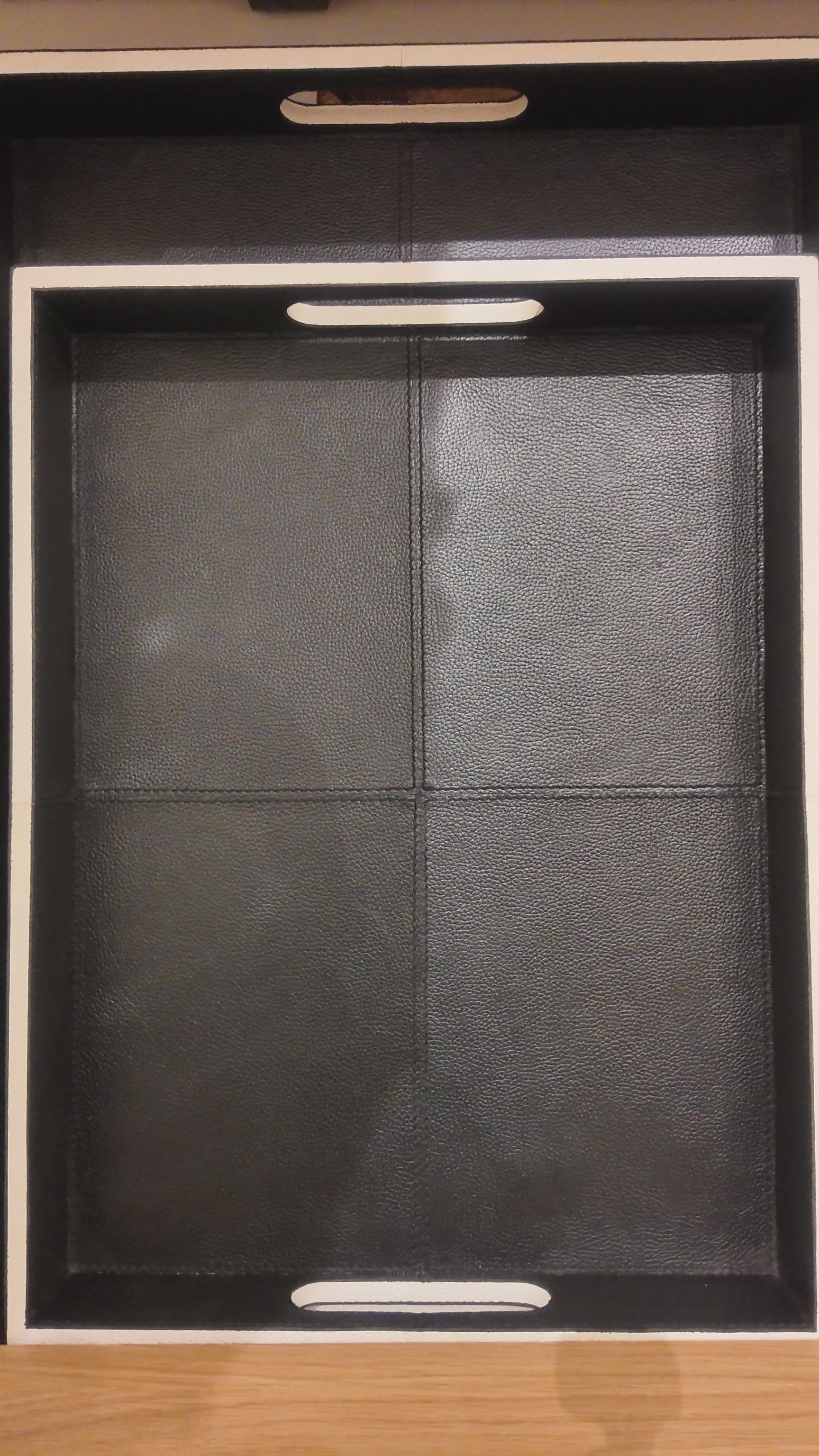 The Merth Tray Set in Black Leather by Made Goods combines full-grain black leather with striking dual tones and dual handles, offering a sophisticated solution for organizing everyday essentials in a compact, shallow design.