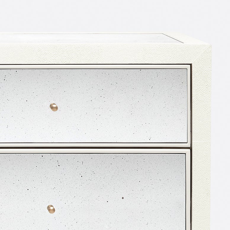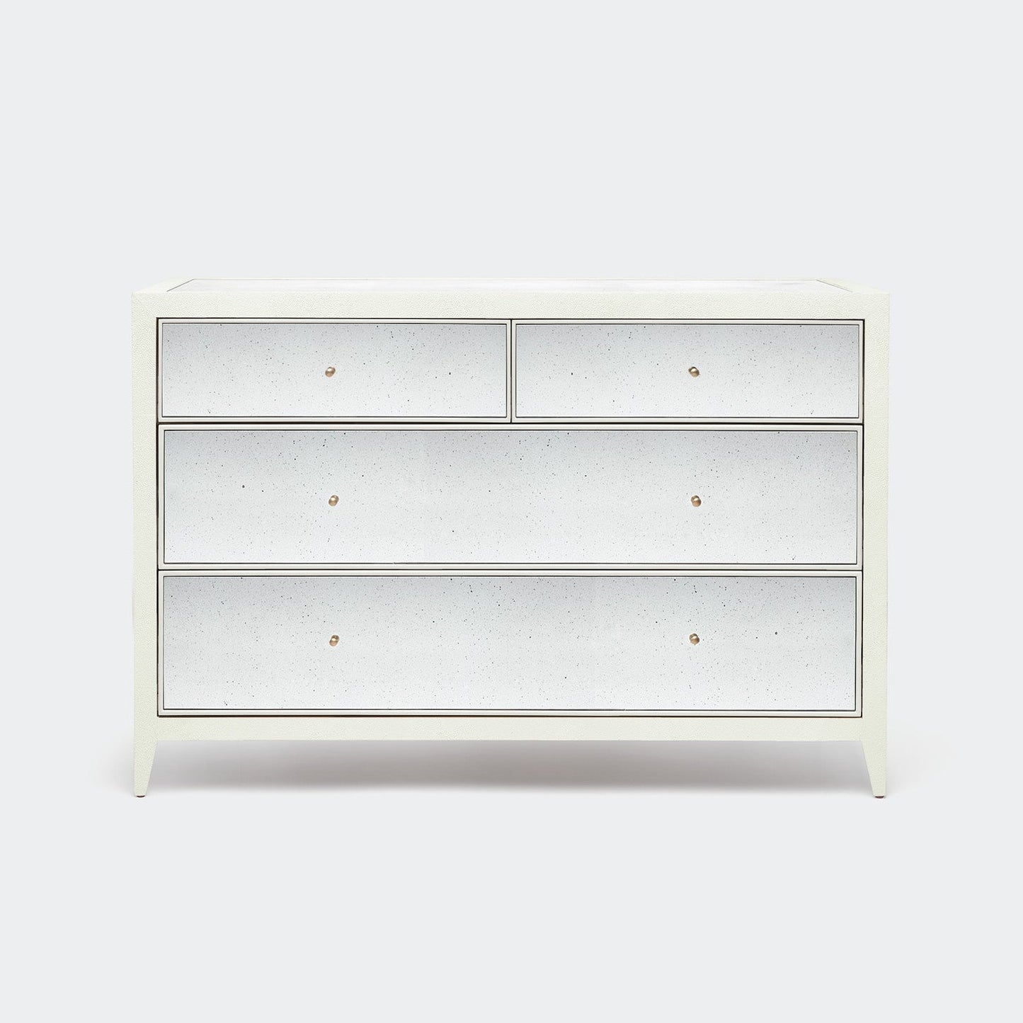 Introducing Made Goods' Mia Dresser, a sleek and reflective rectangle featuring a mix of Pristine Vintage Faux Shagreen and hand-antiqued mirror panels. This 48" dresser adds light to any room and offers convenient storage with 4 drawers.