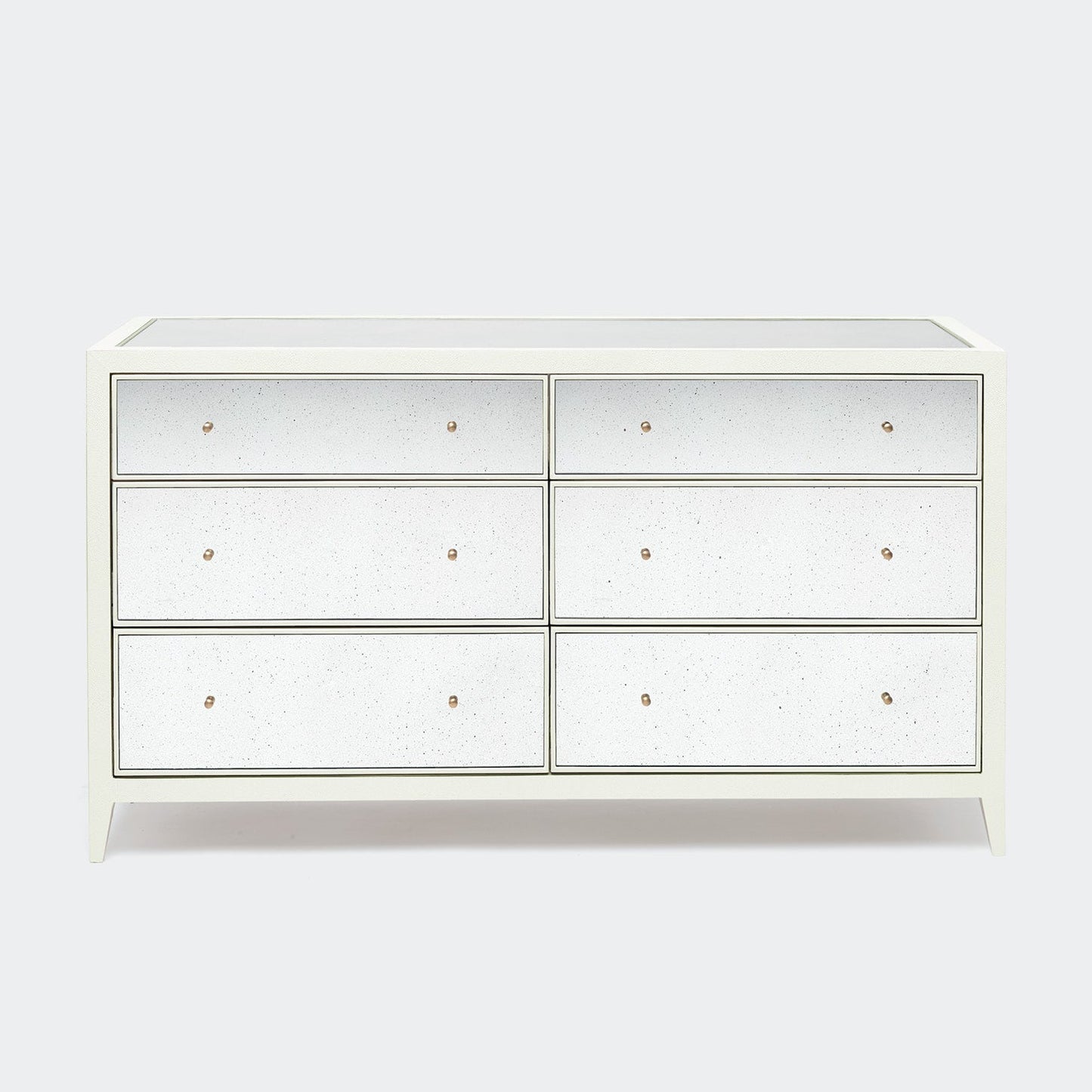 Elevate your home decor with the Mia Dresser 60" in Pristine Vintage Faux Shagreen. Featuring a hand antiqued mirror and a silver oak base, this spacious cabinet with six drawers offers stylish storage for your personal belongings. Perfect for bedrooms, dining rooms, and living rooms.