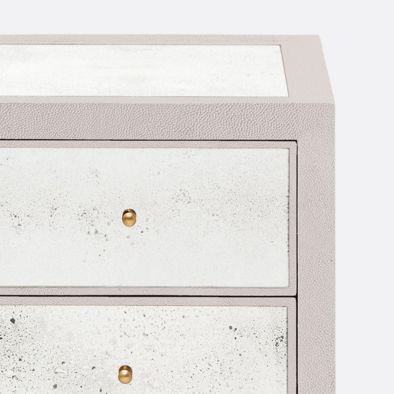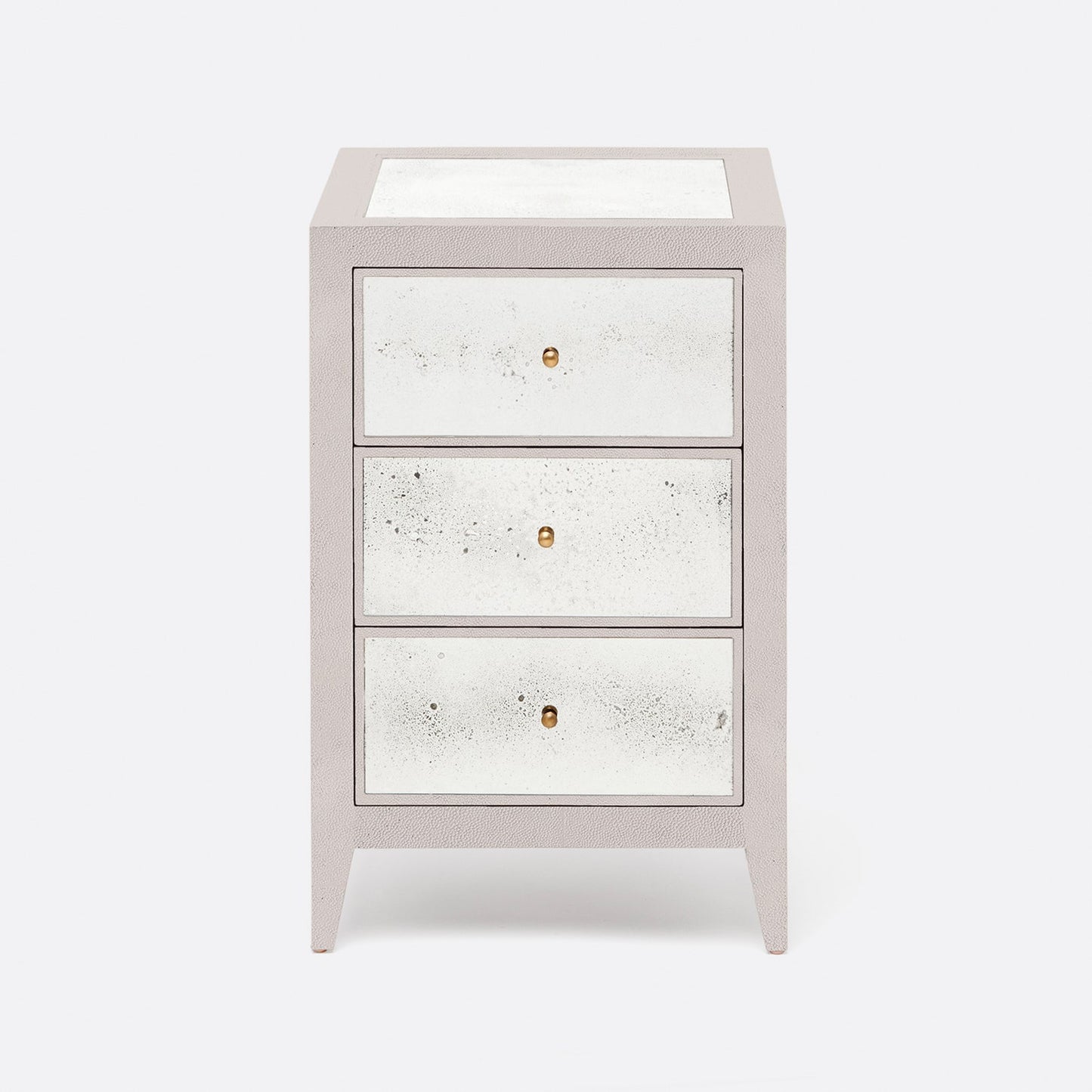 The Mia Single Nightstand in French Gray Vintage Faux Shagreen boasts a mix of materials and finishes, including antiqued mirrored panels and gold drawer pulls. This modern side table has three drawers and tapered legs, providing elegant design and storage for personal items.