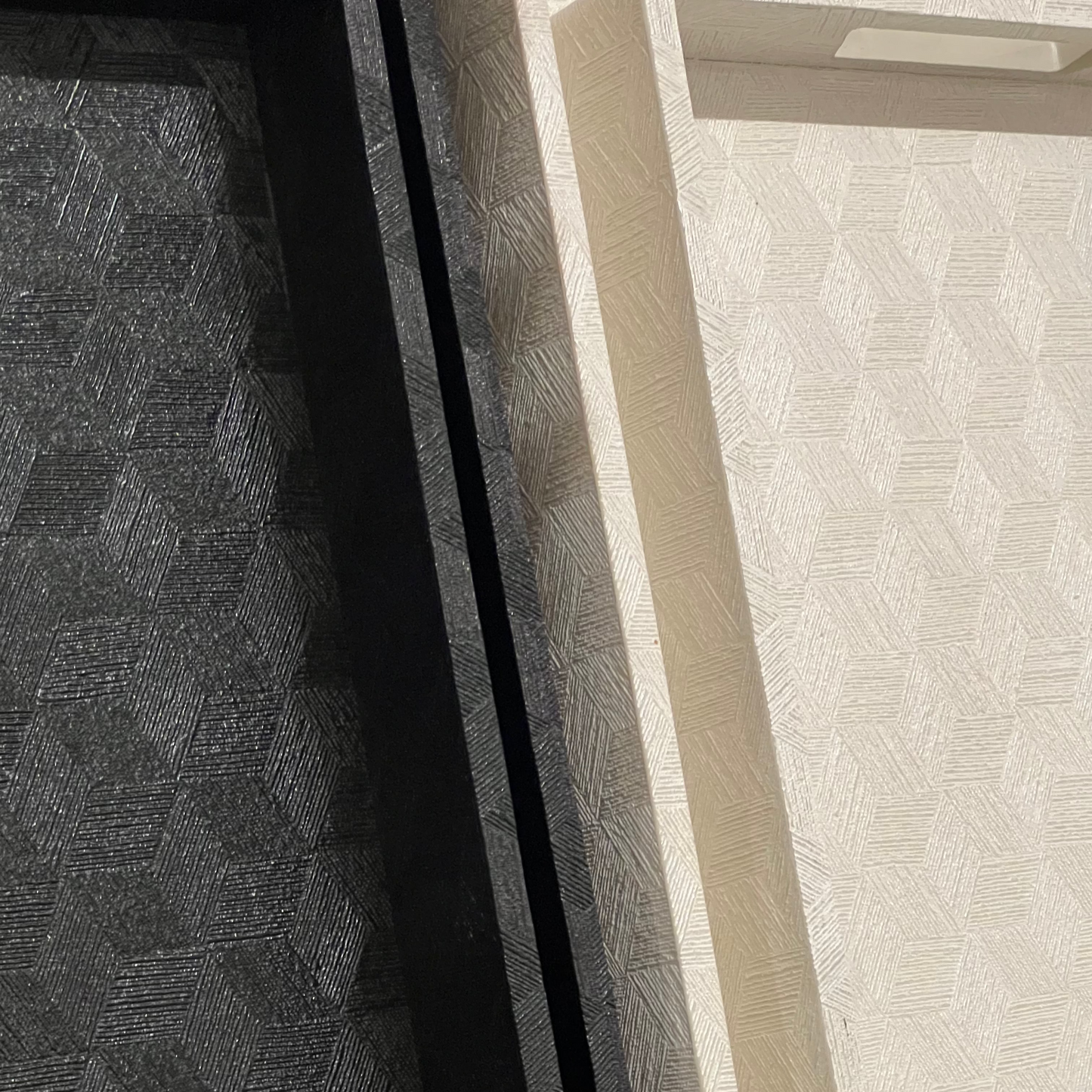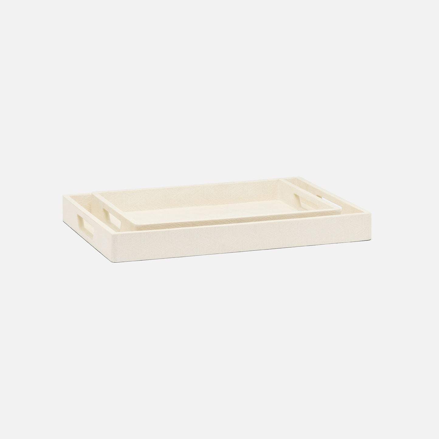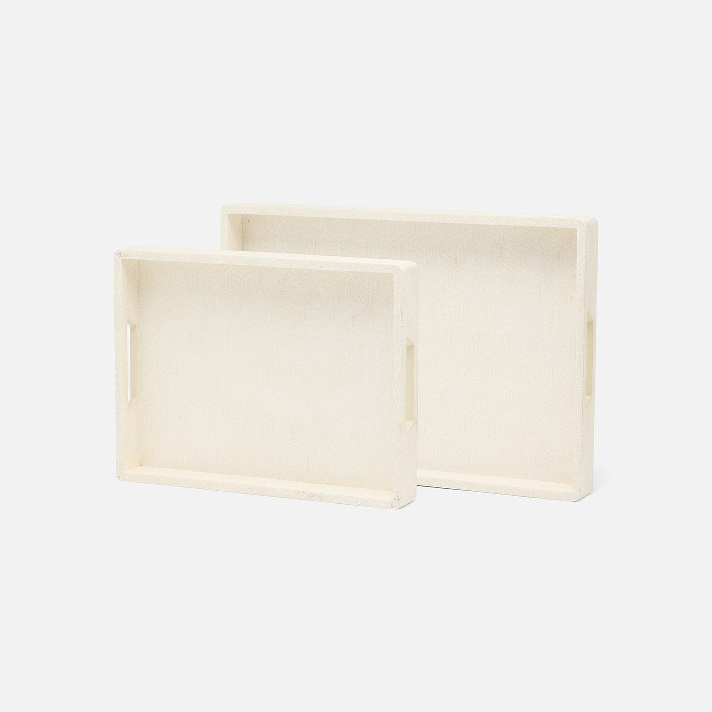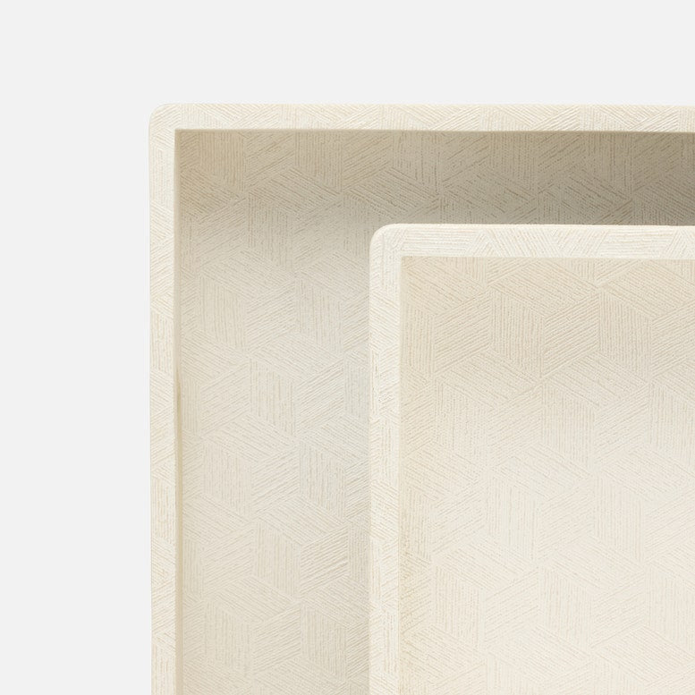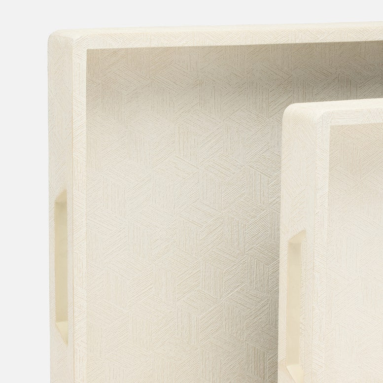 Crafted using handwoven techniques, the Mundrick Tray Set in Blanc Faux Silk by Made Goods is textured to the touch and makes for an artful addition in a variety of settings. A cube-like pattern adds a dash of dimension to the look.