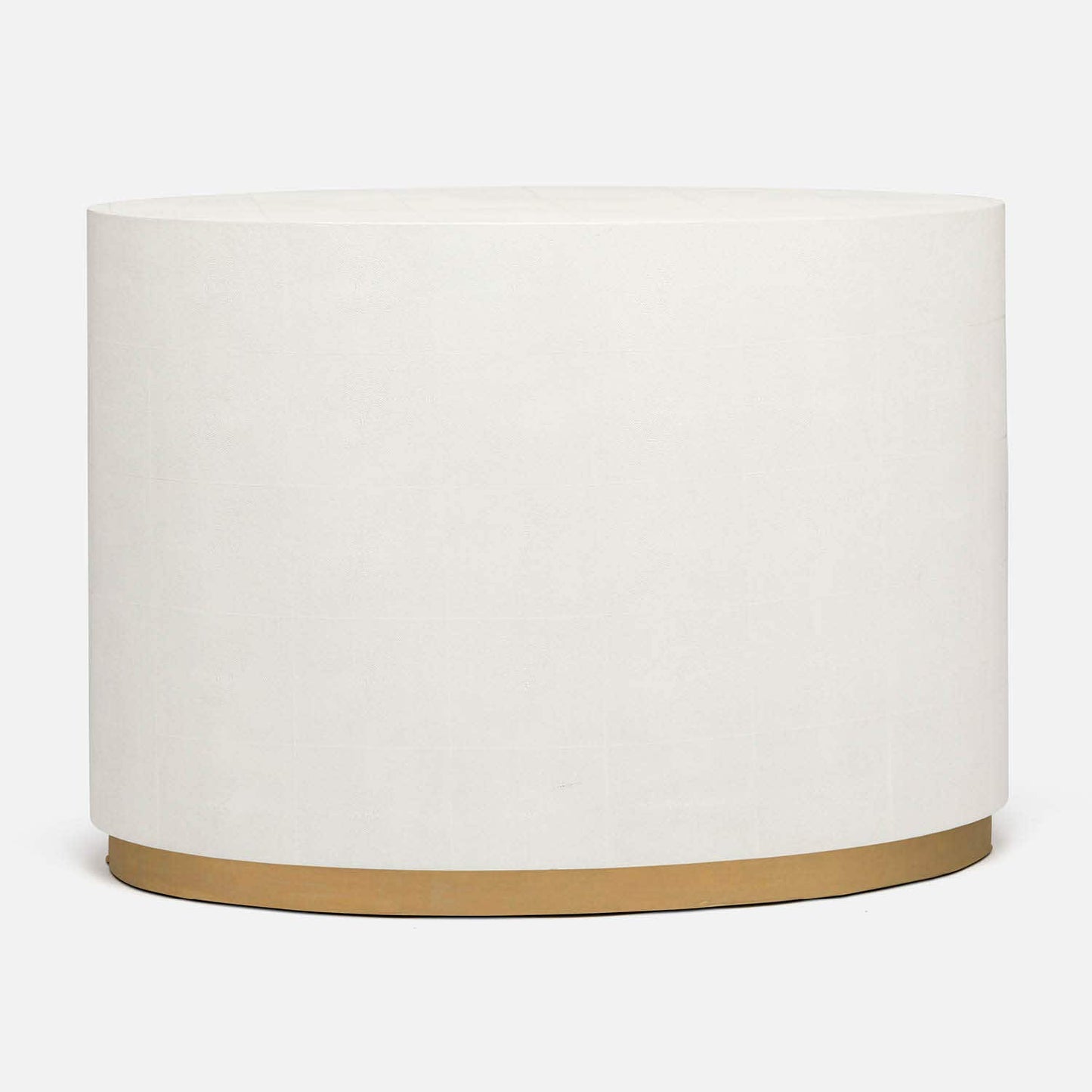 The modern shape of the oval Nerine Dresser in Pristine Vintage Faux Shagreen and Antique Gold Metal from Made Goods is grounded in the organic pattern of its full faux shagreen finish. The textured white material adds a clean look to the dresser's curves; a brass base is a chic finishing detail.
