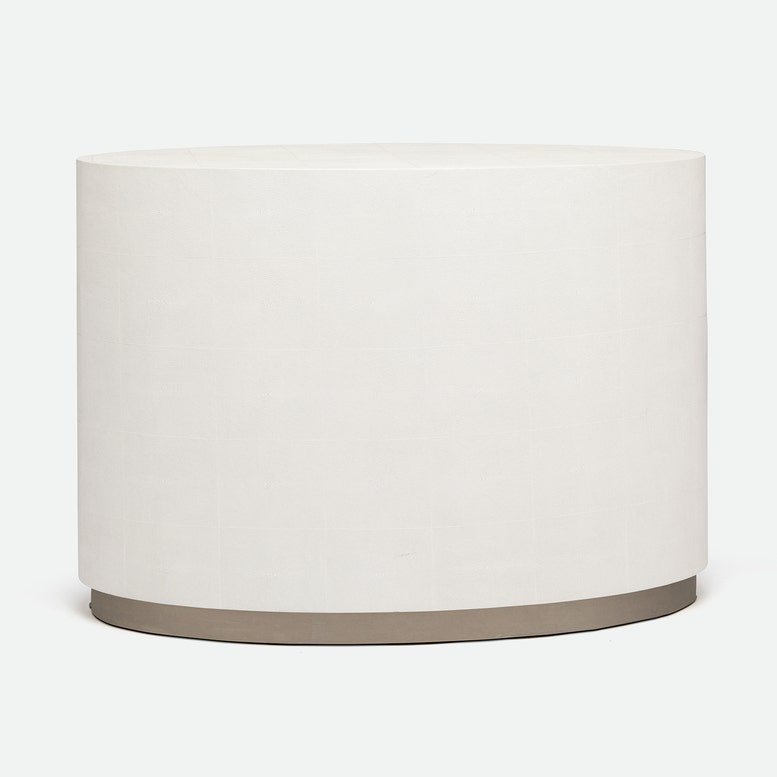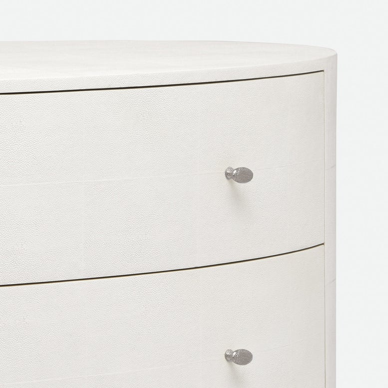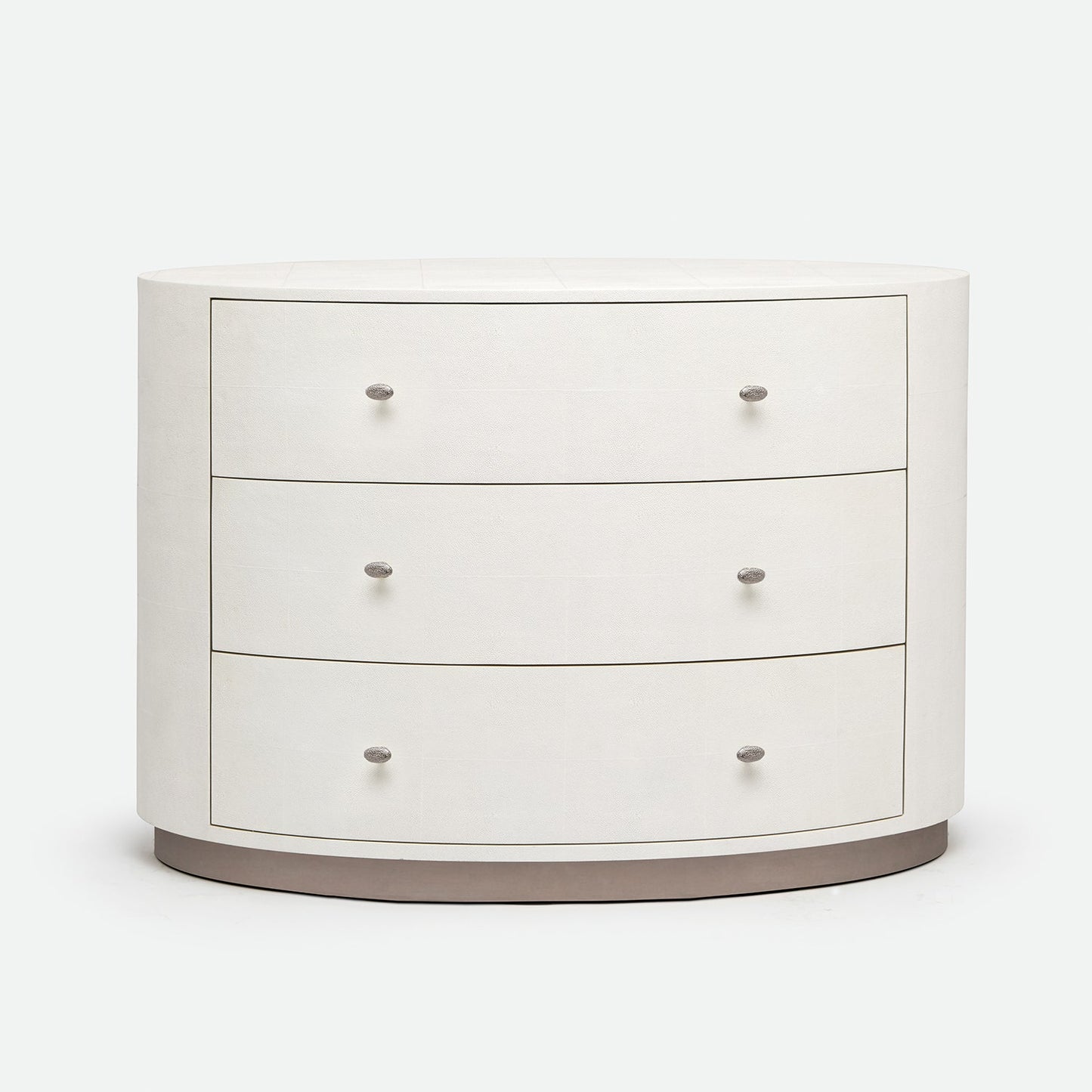 The modern shape of the oval Nerine Dresser in Pristine Vintage Faux Shagreen and Silver Metal from Made Goods is grounded in the organic pattern of its full faux shagreen finish. The textured white material adds a clean look to the dresser's curves; a silver base is a chic finishing detail.