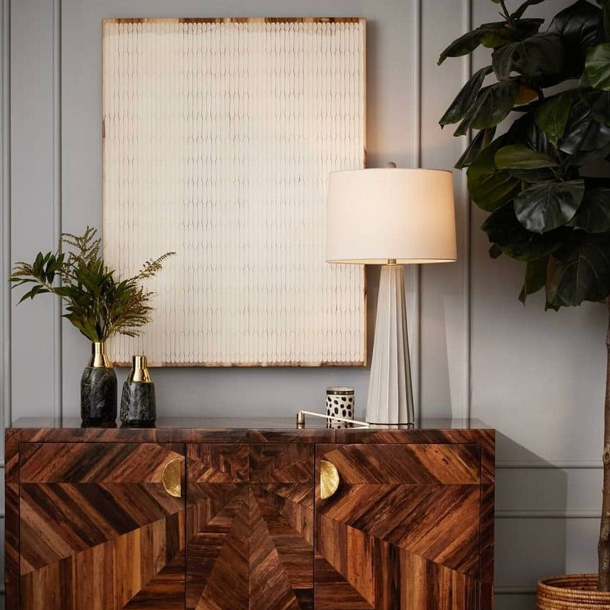 Made Goods Nova Table Lamp in white concrete, topped with a tapered linen drum shade, has the sleek lines of contemporary lighting. This tall modern table lamp features silver leaf tipping that adds a hint of glamour.