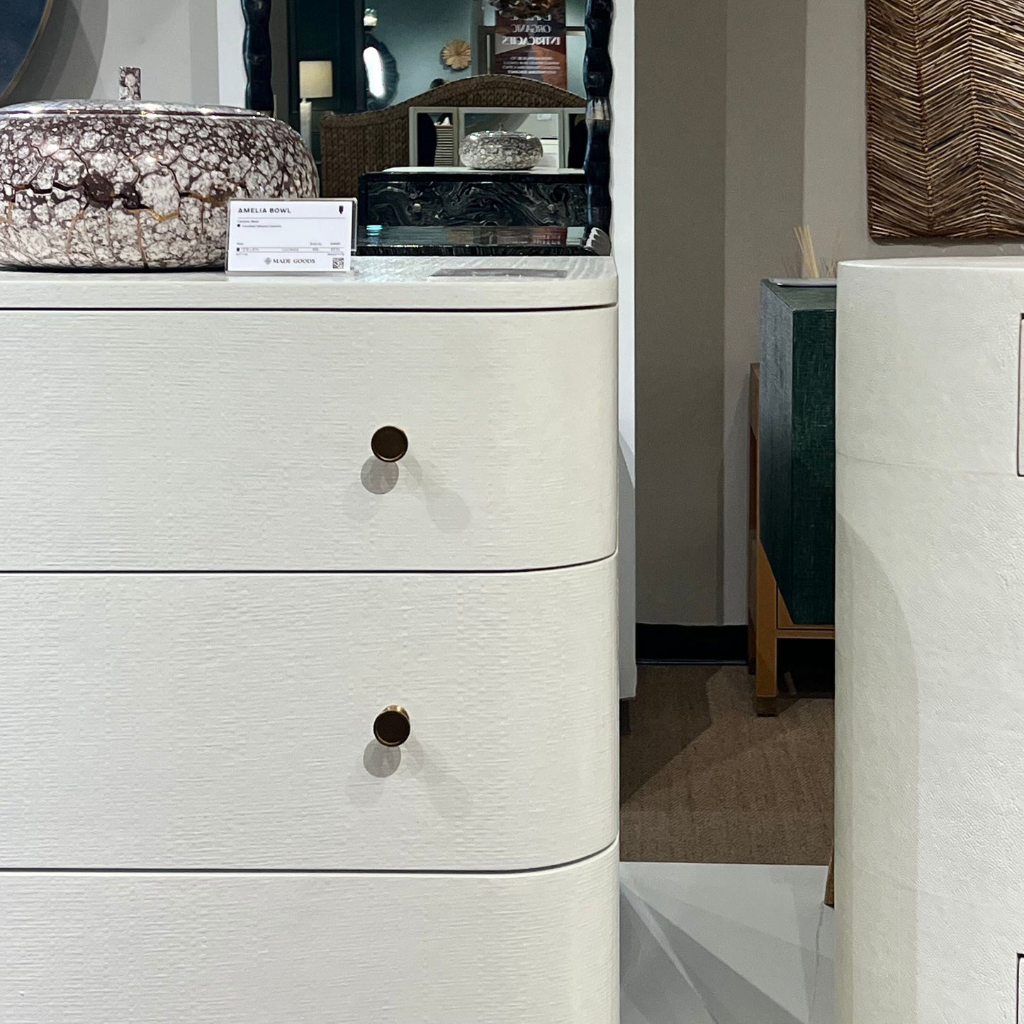 Add elegance to any room with Olivia 3 Drawer Dresser in Pristine Faux Raffia. Chic and functional, this Art Deco-inspired piece from Made Goods features faux raffia, rounded corners, and tapered legs. Perfect for bedrooms, dining rooms, or offices for storage and style.