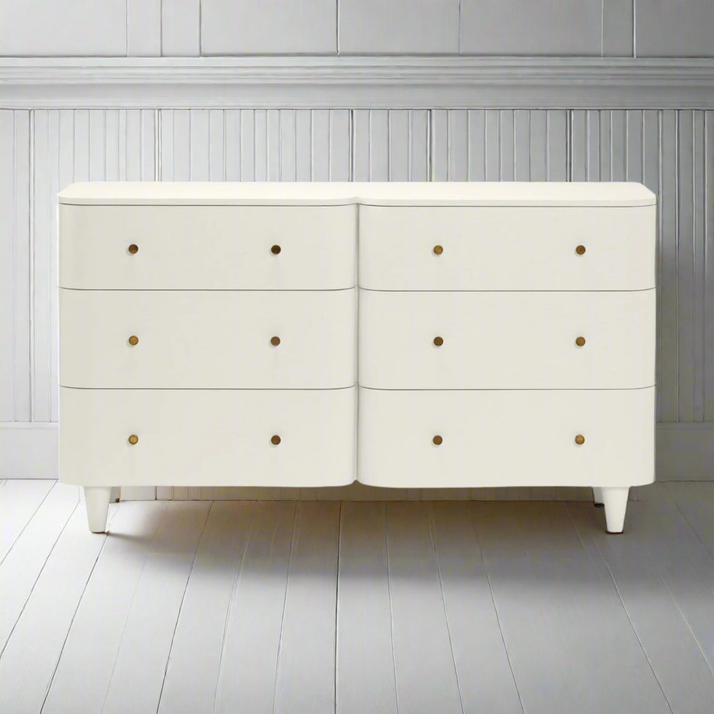 Inspired by Art Deco, the Olivia Dresser from Made Goods exudes refined, classic Upper East Side style. The new extra-long option offers double the storage and is perfect for couples or those seeking extra-chic organization. Collection features rounded corners, tapered legs, and stylish hardware.