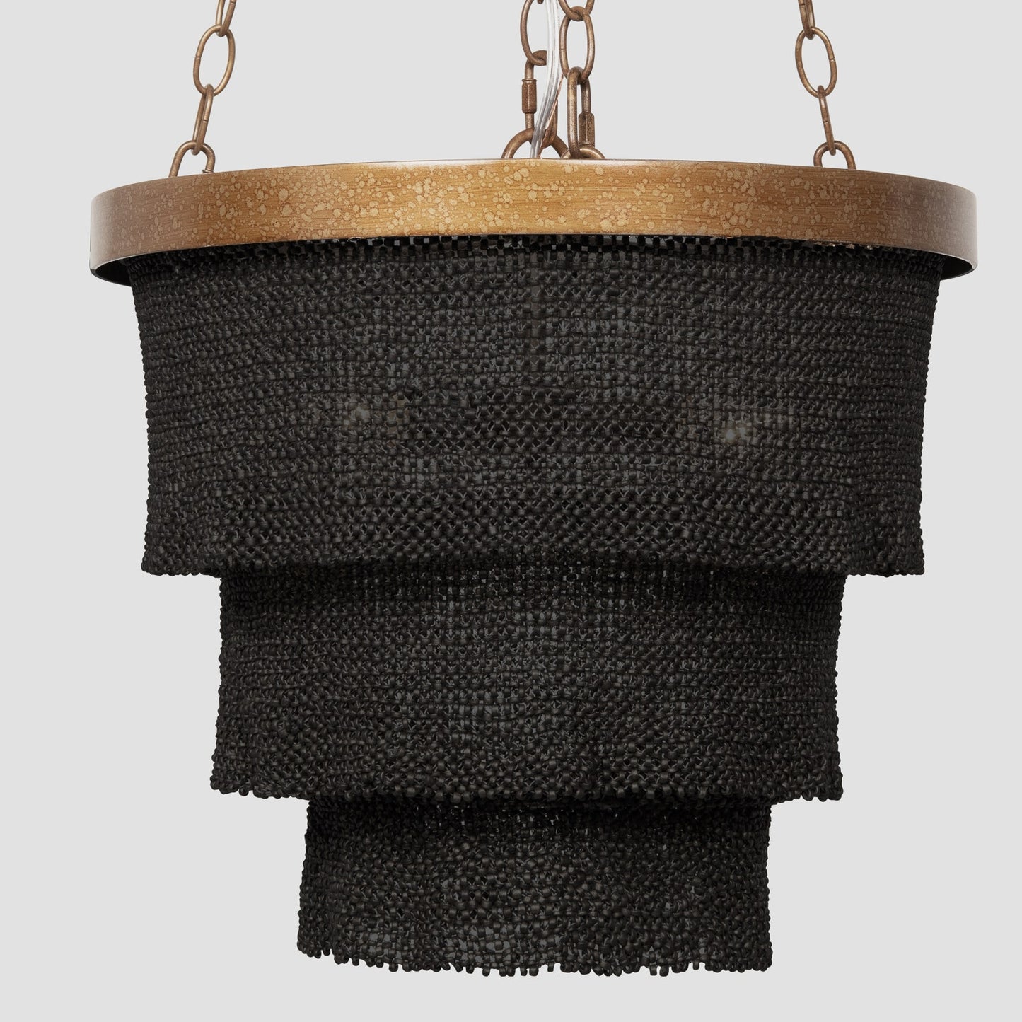 The Patricia Chandelier with Black Coco Beads and Gold from Made Goods is woven tightly into three overlapping concentric rings that move languidly in a round profile. With a slight ruffle along the edge and a flirtatious silhouette, the Patricia is pure glamour.