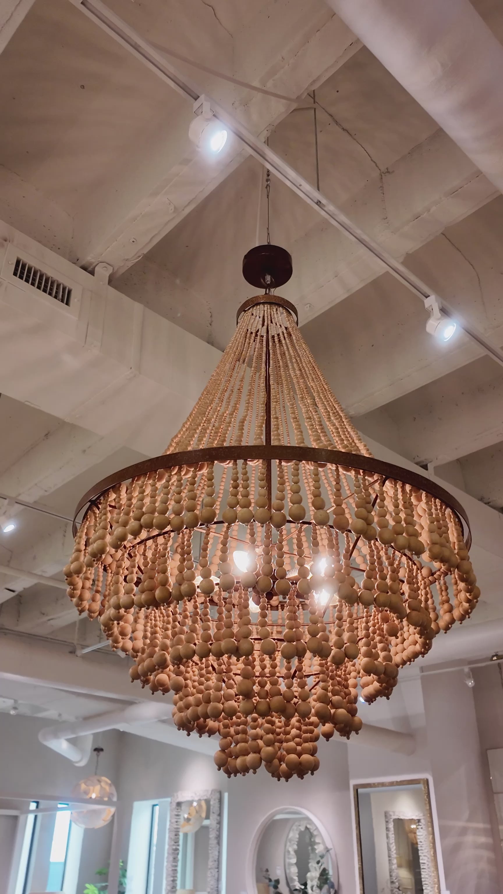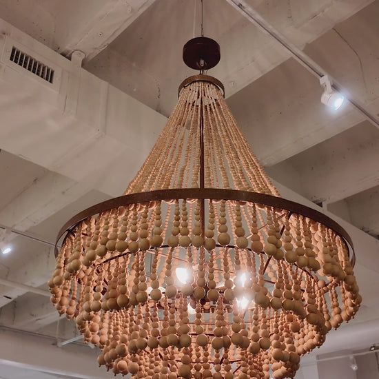 The Pia Large Chandelier Gold by Made Goods boasts a 5-tiered, gold frame adorned with numerous natural wood beads of varying sizes. This chic hanging light exudes an elegant and rustic ambiance, making it a versatile addition to any room in your home.