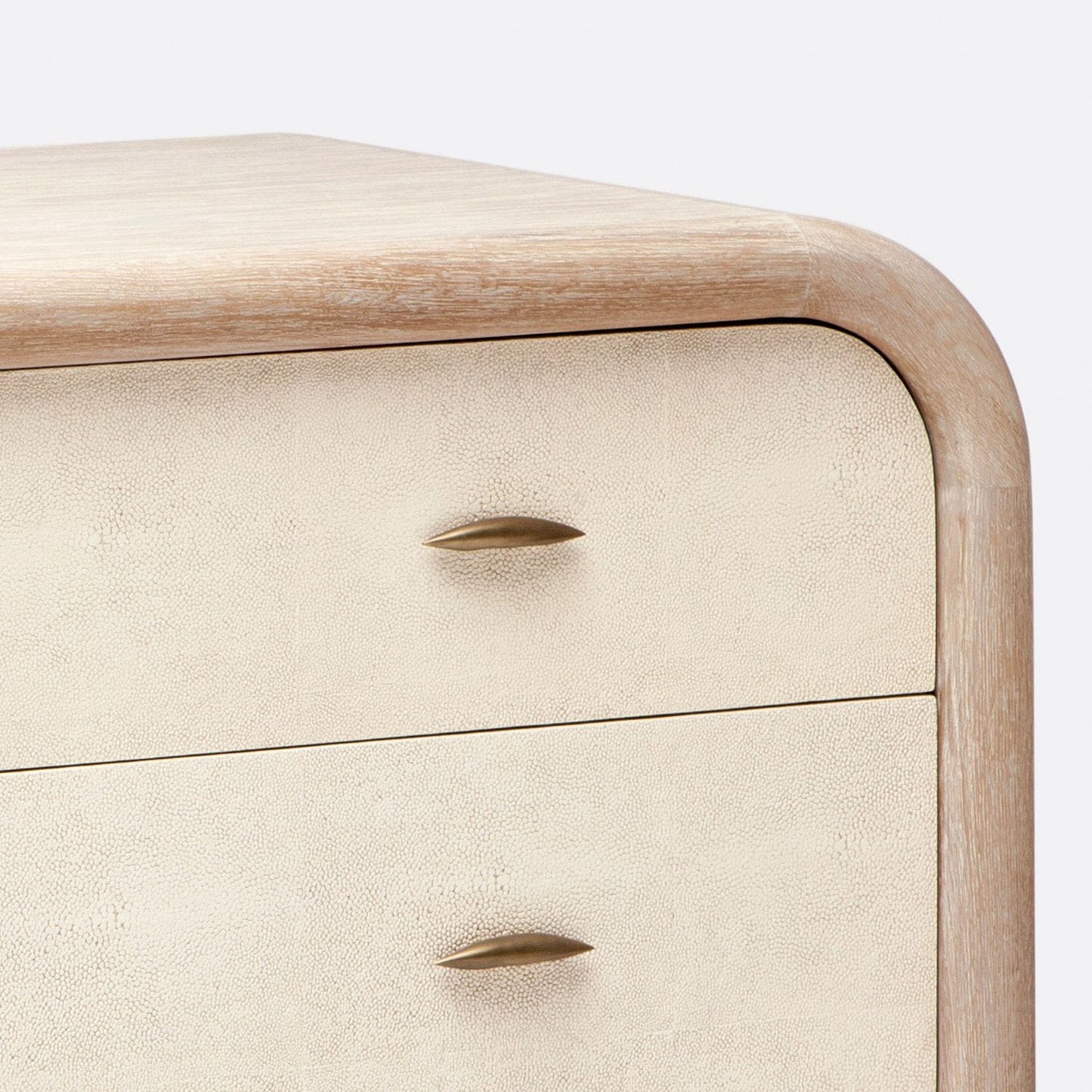 The Pierre 48" Dresser in Off-White and Whitewashed Oak from Made Goods features a rounded frame that takes its cue from the late '60s, with whitewashed oak and faux shagreen drawer panels making it a contemporary beauty. The shape highlights the wood's gorgeous grain and tapered legs provide a shapely finish.