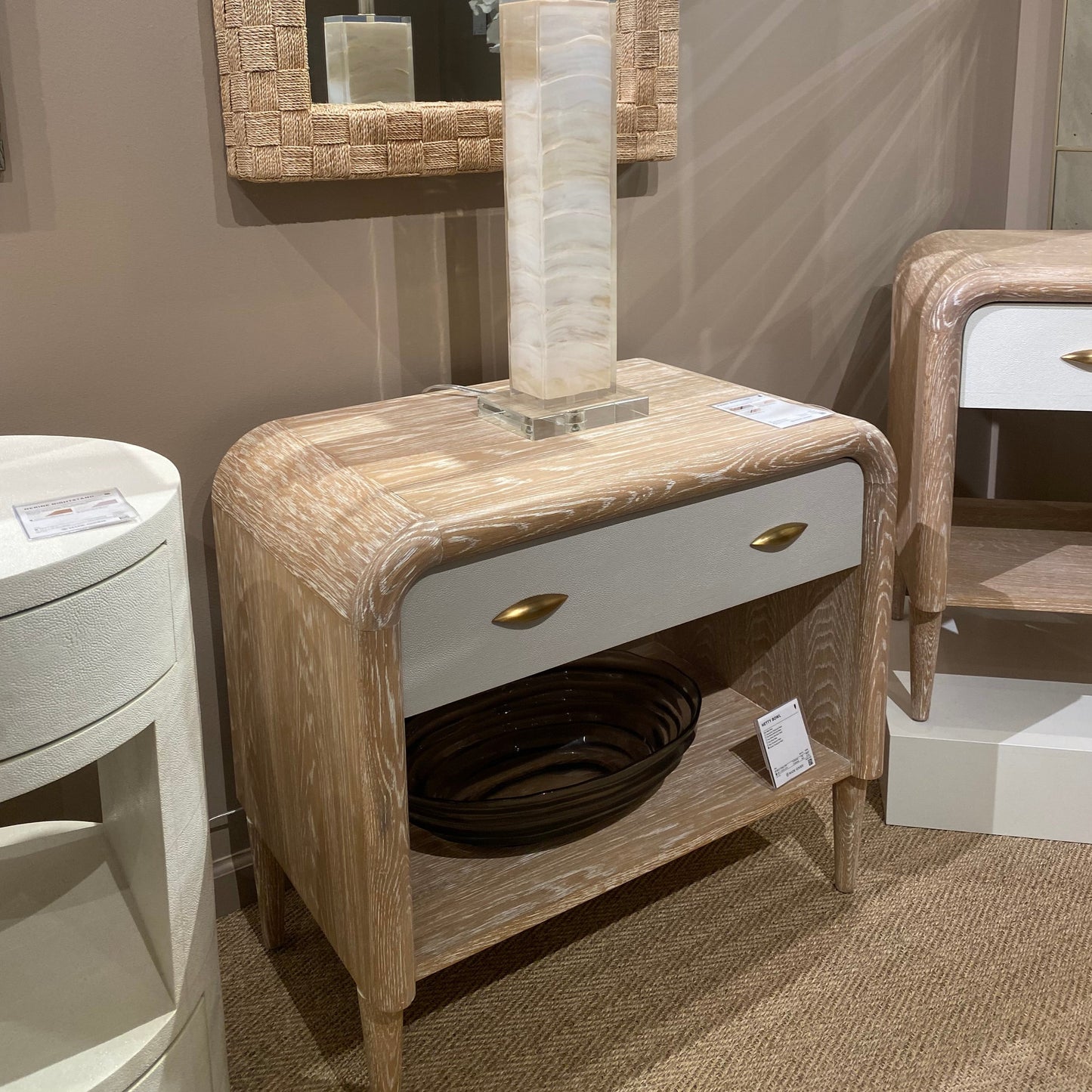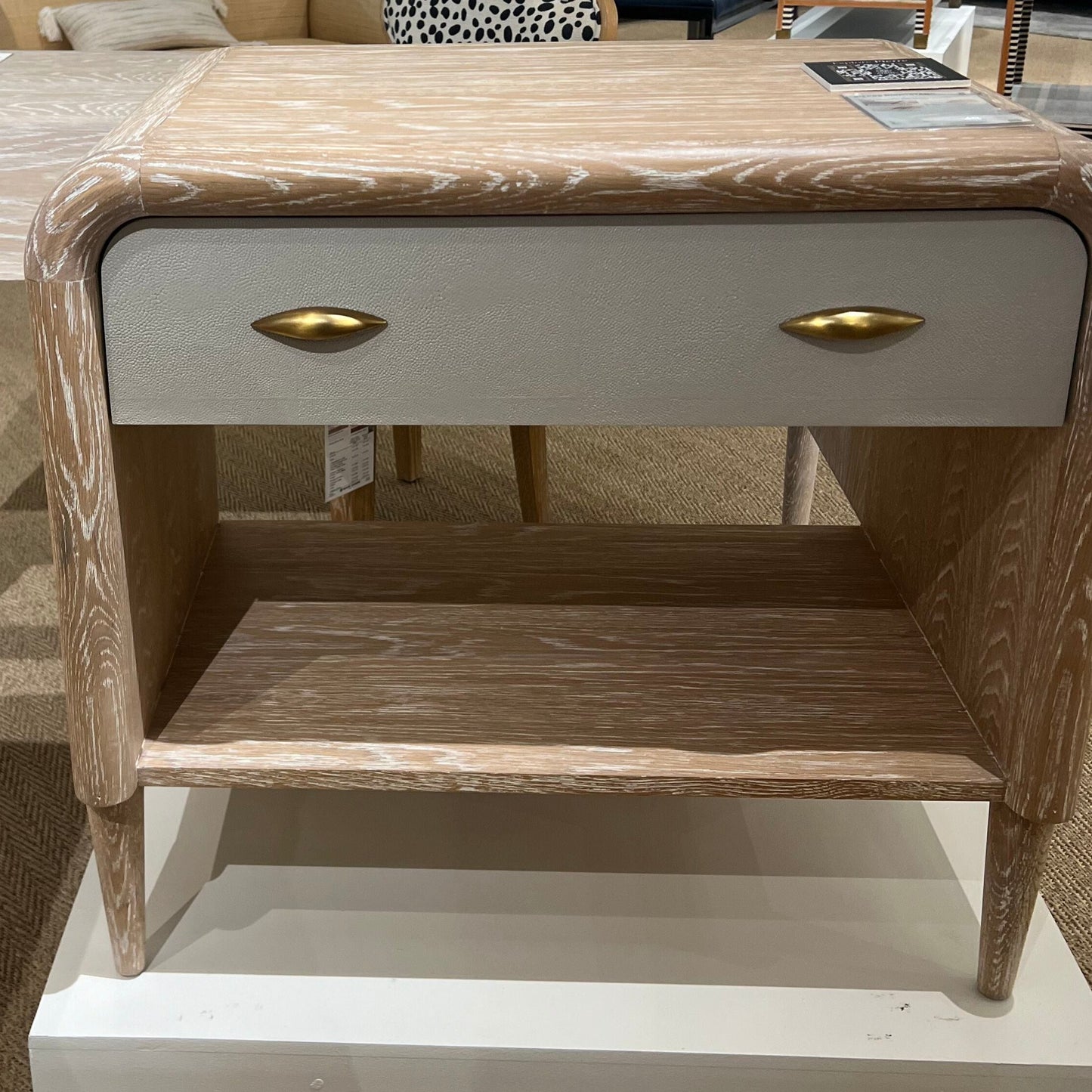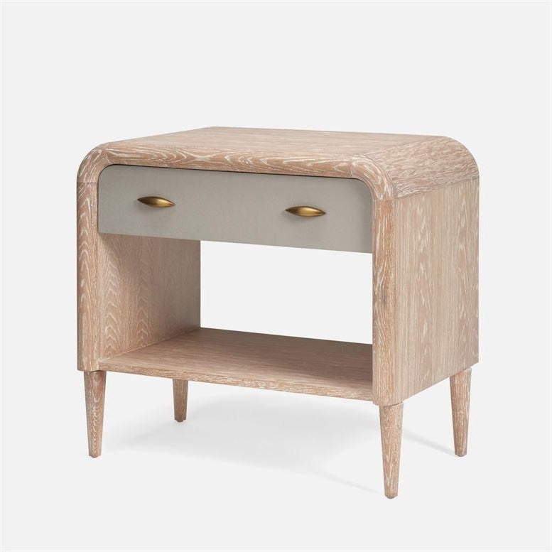The Pierre Double Nightstand in French Gray and Whitewash from Made Goods features a rounded frame that takes its cue from the late '60s, with whitewashed oak and faux shagreen drawer panels making it a contemporary beauty. The shape highlights the wood's gorgeous grain and tapered legs provide a shapely finish.