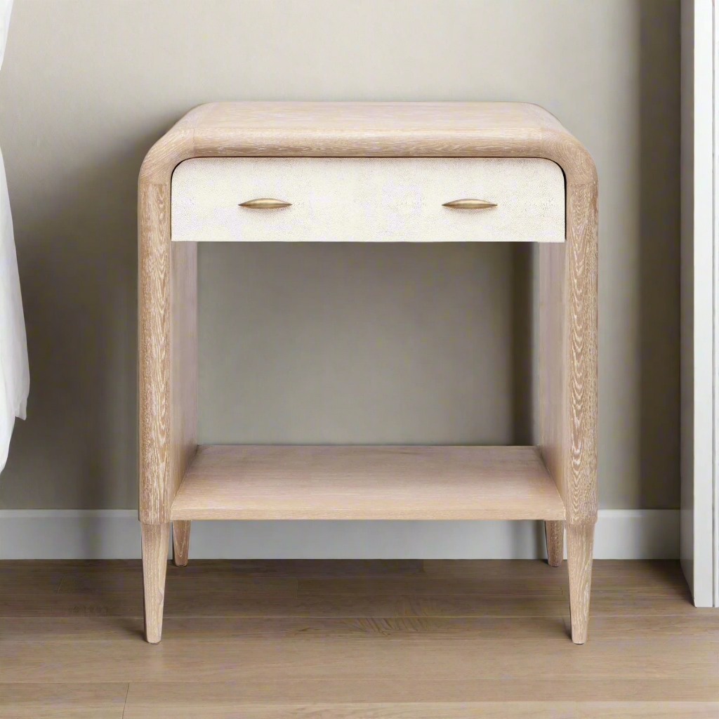 The Pierre Double Nightstand in Pristine and Whitewash from Made Goods features a rounded frame that takes its cue from the late '60s, with whitewashed oak and faux shagreen drawer panels making it a contemporary beauty. The shape highlights the wood's gorgeous grain and tapered legs provide a shapely finish.