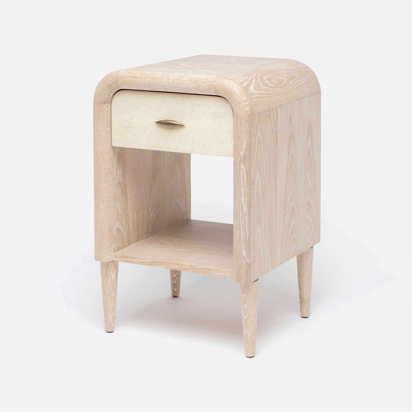The Pierre Single Nightstand in Off White and Whitewashed Oak from Made Goods features a rounded frame that takes its cue from the late '60s, with whitewashed oak and faux shagreen drawer panels making it a contemporary beauty. The shape highlights the wood's gorgeous grain and tapered legs provide a shapely finish.