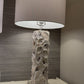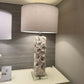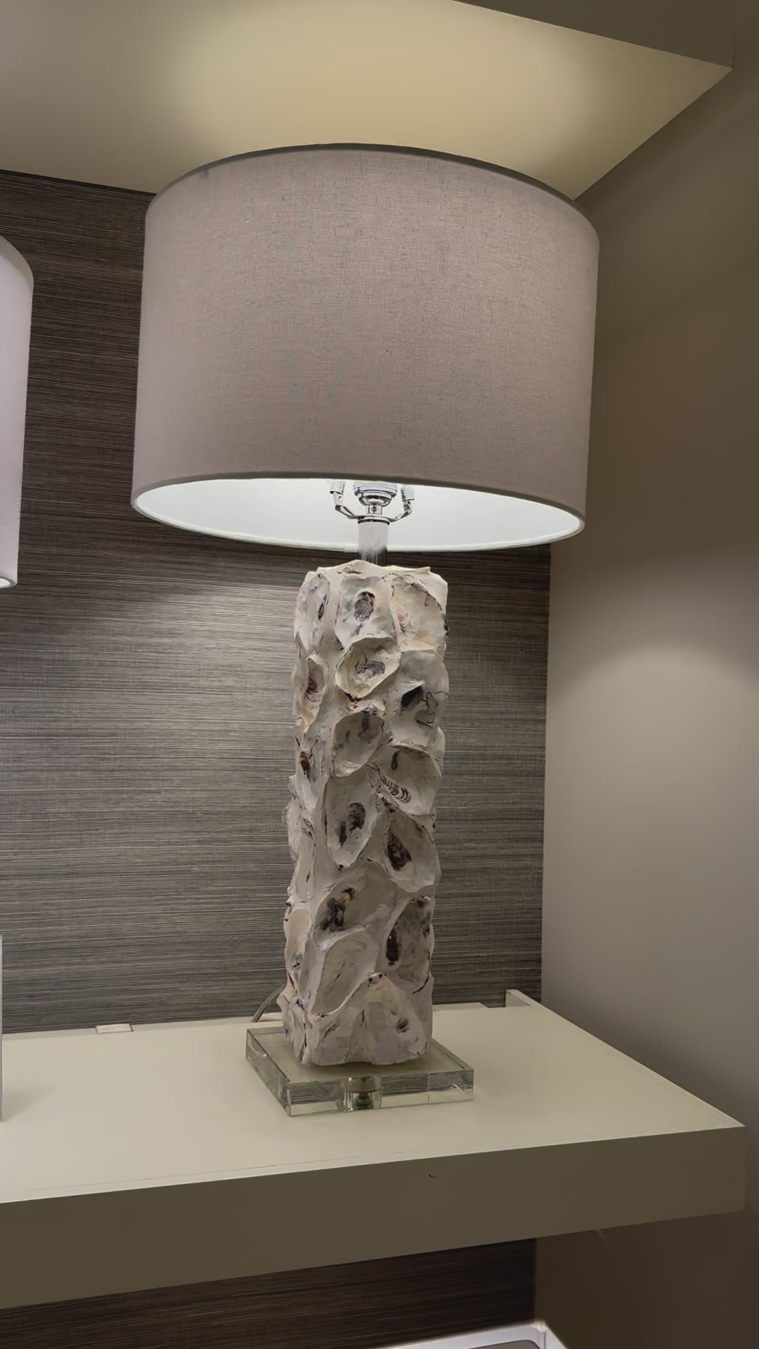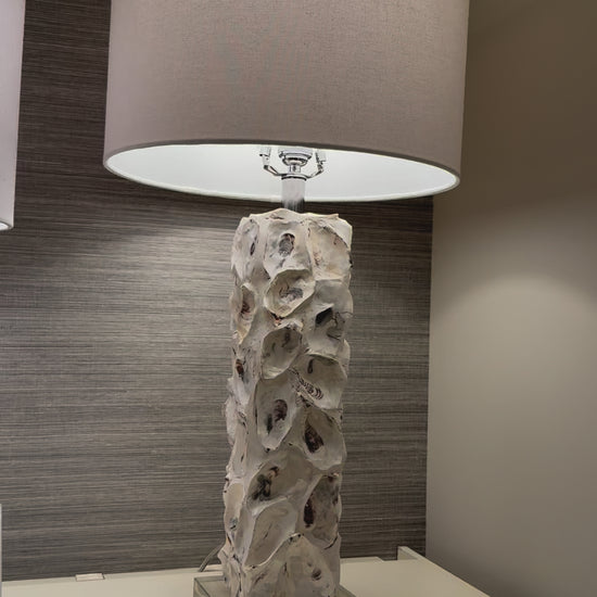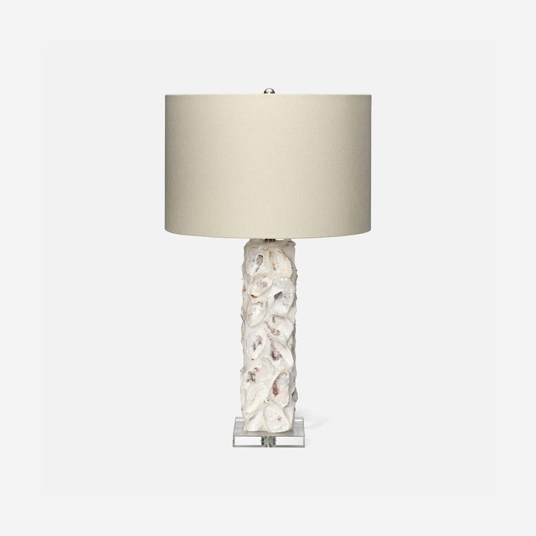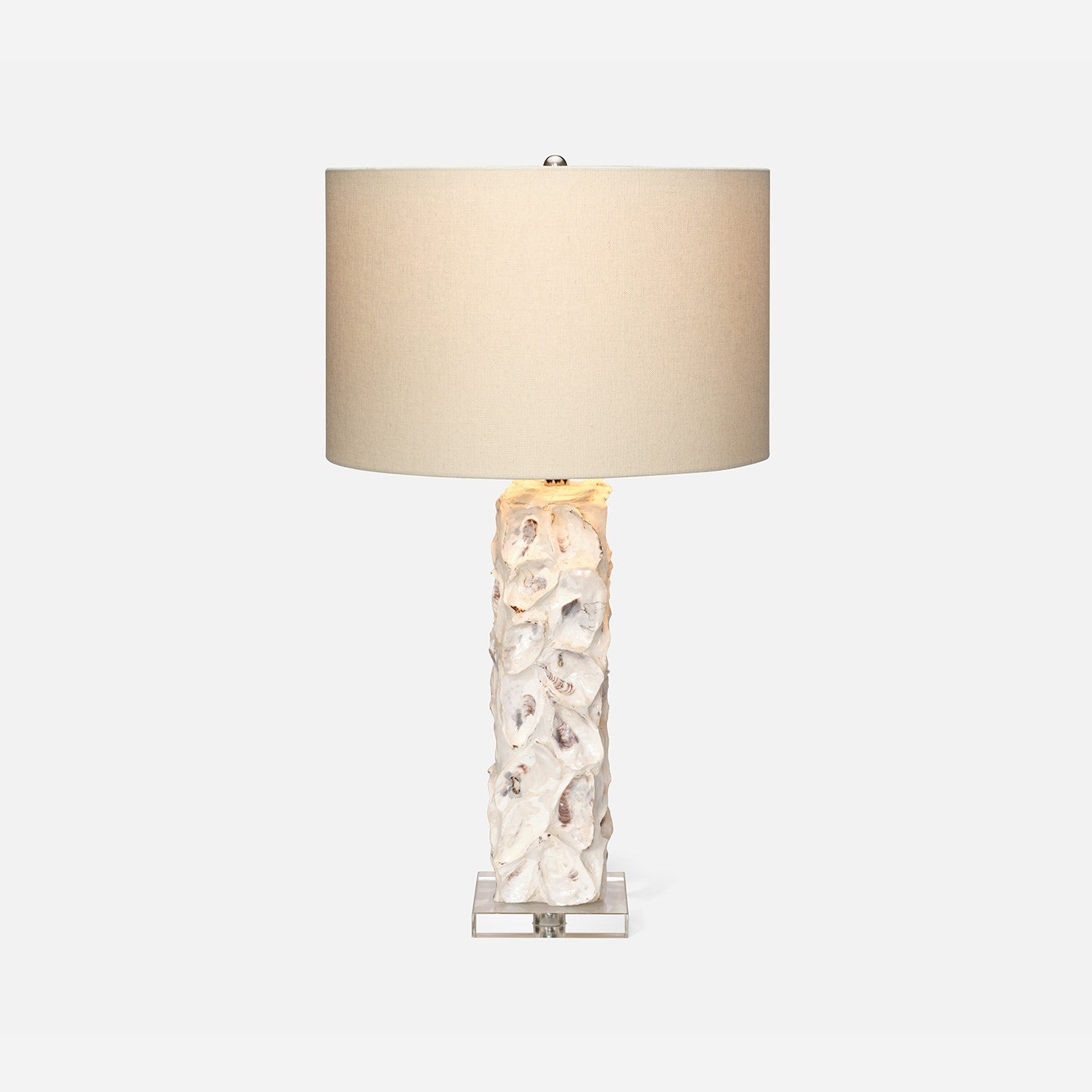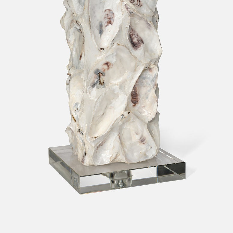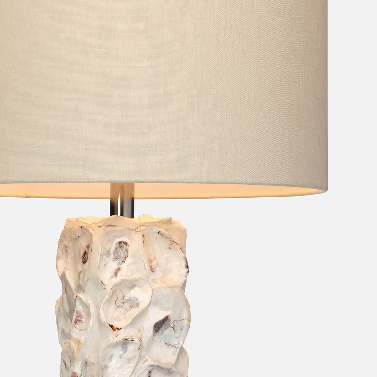 Chic and beachy, the sculptural Raina Floor Lamp in White Mix Oyster Shell from Made Goods is made from oyster shells stacked in a plaster resin. The Raina is the perfect eye-catching floor lamp for illuminating any space.