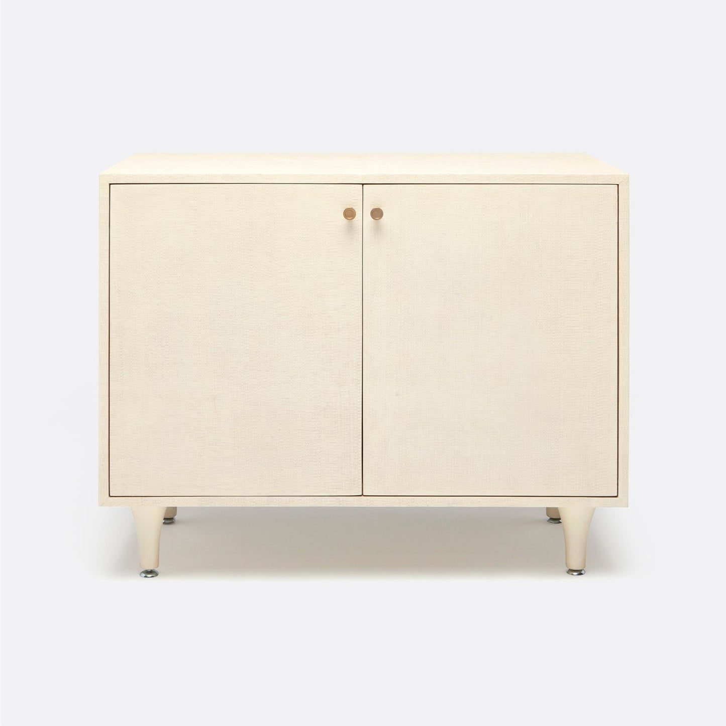 Faux Raffia; Brass Hardware; 2 Compartments; 1 Adjustable Shelf; 2 Cord Cutouts