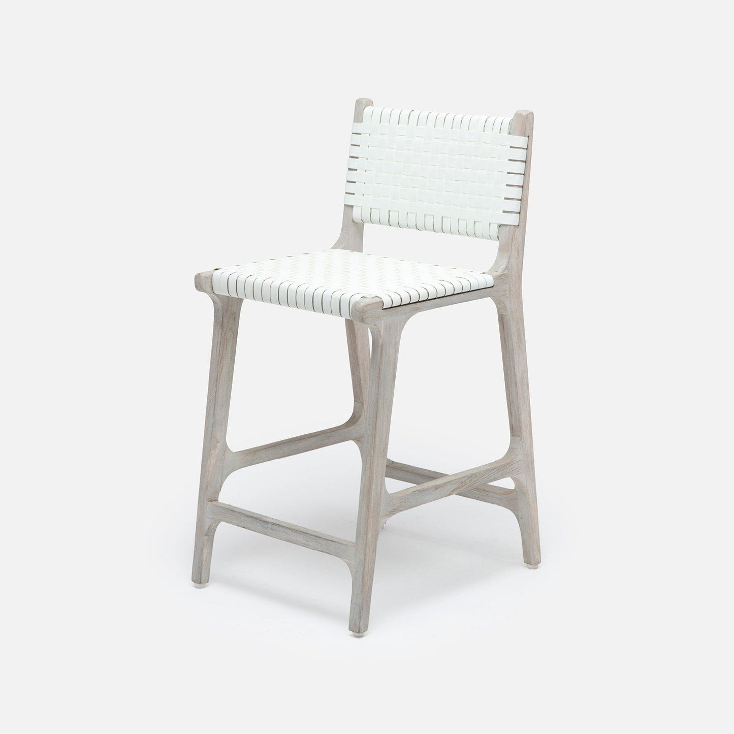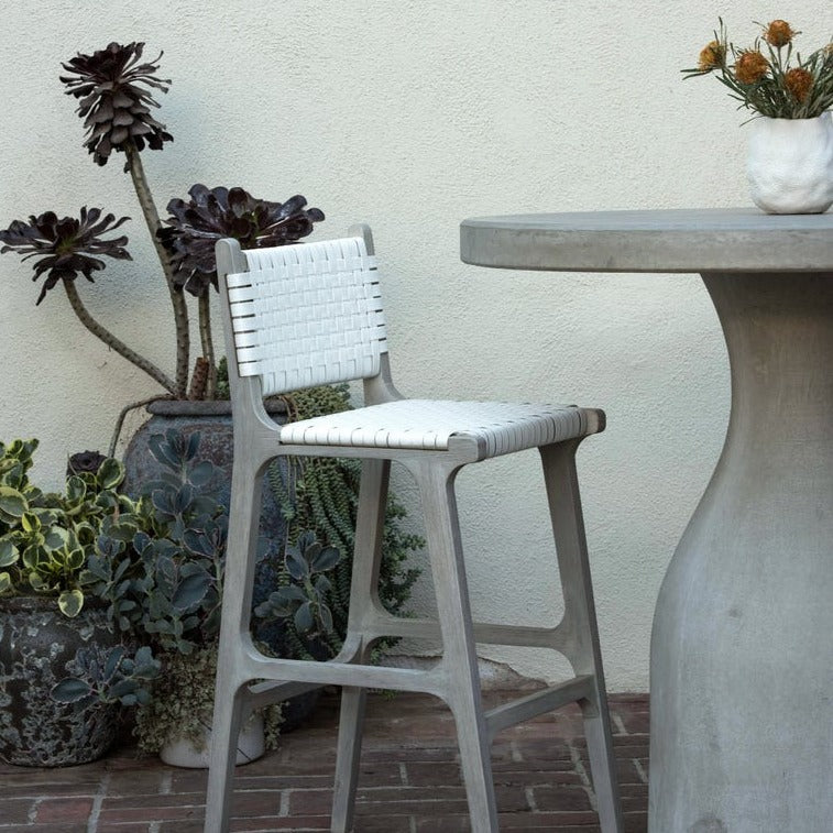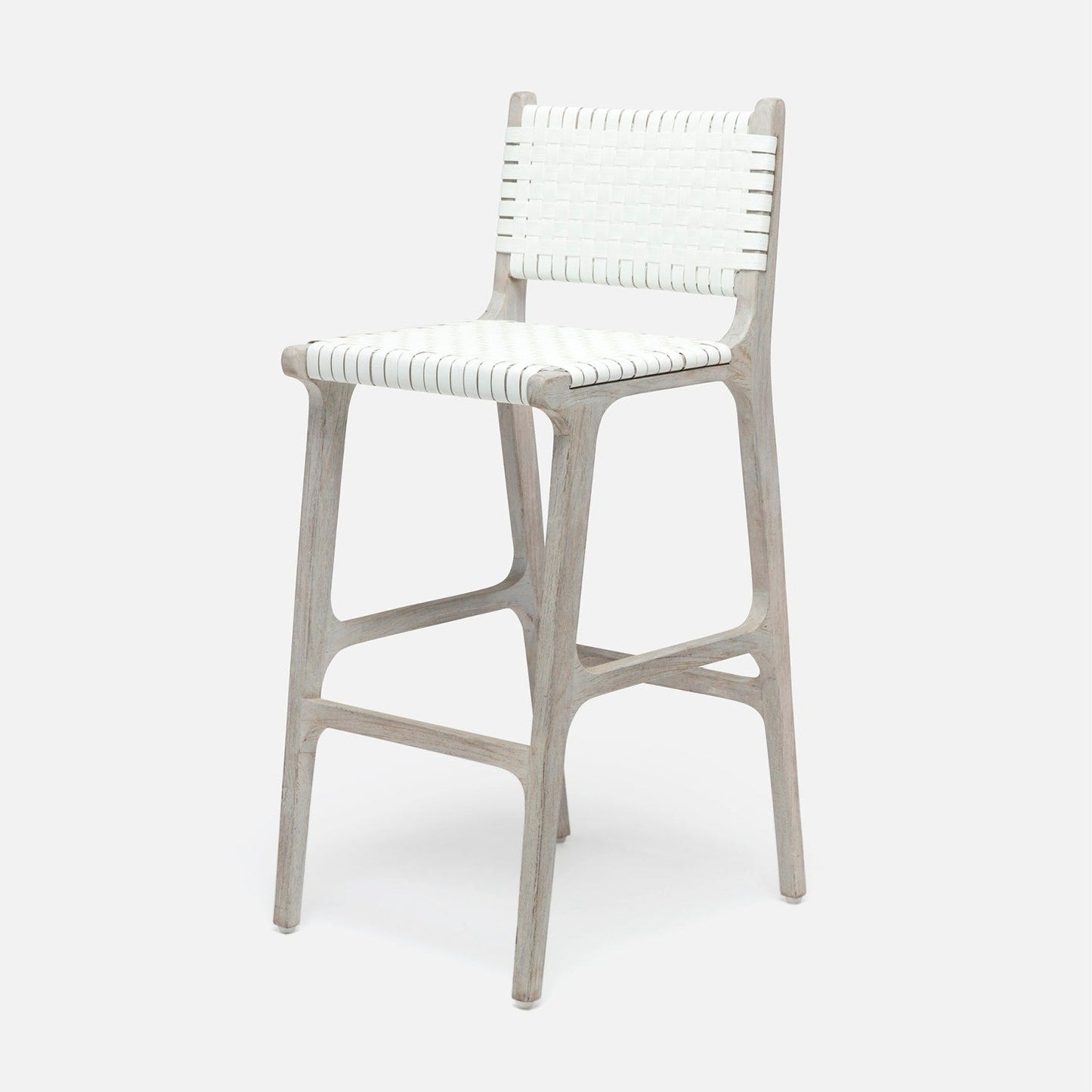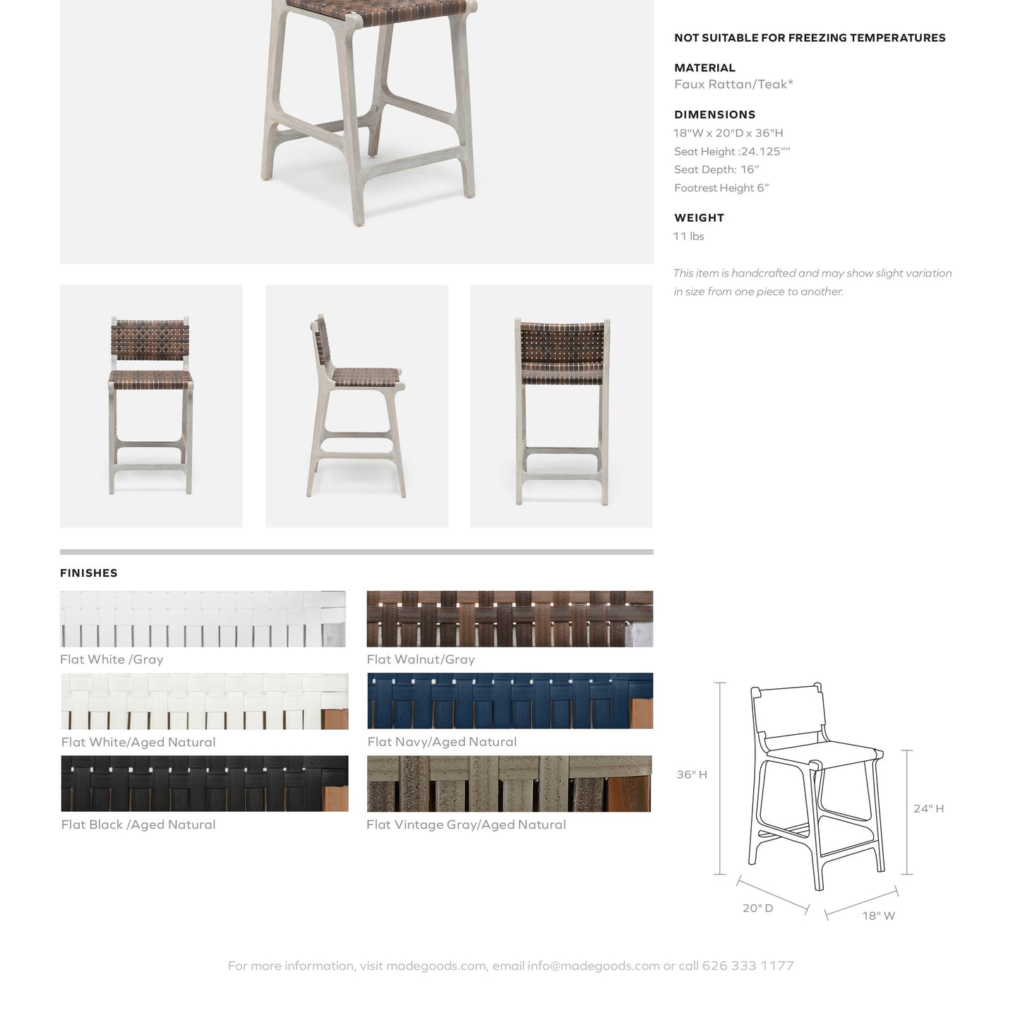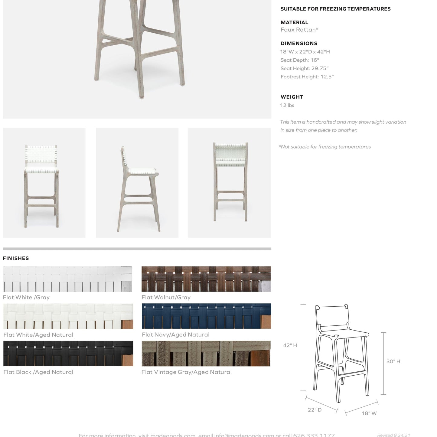 The Rawley Bar and Counter Stool in White and Gray Teak from Made Goods is made with faux rattan and a teak wood base, this collection is designed to withstand the elements and is versatile for both indoor and outdoor. *Variations expected.